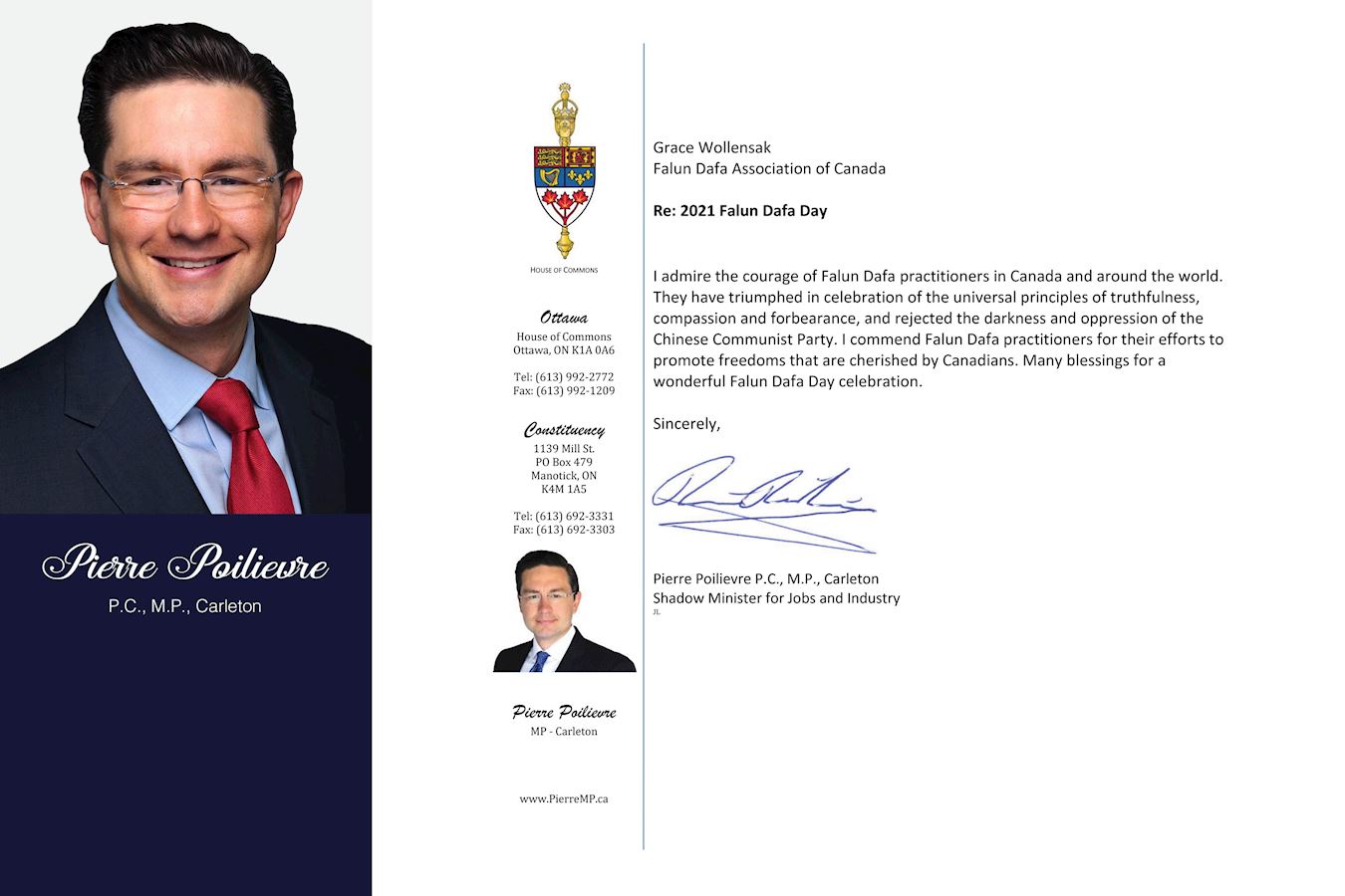 圖2:保守黨影子內閣工作及工業部長、渥太華選區國會議員鮑利夫(Pierre Poilievre)在賀信中寫道:法輪功學員在洪揚真善忍普世價值方面大功告成。