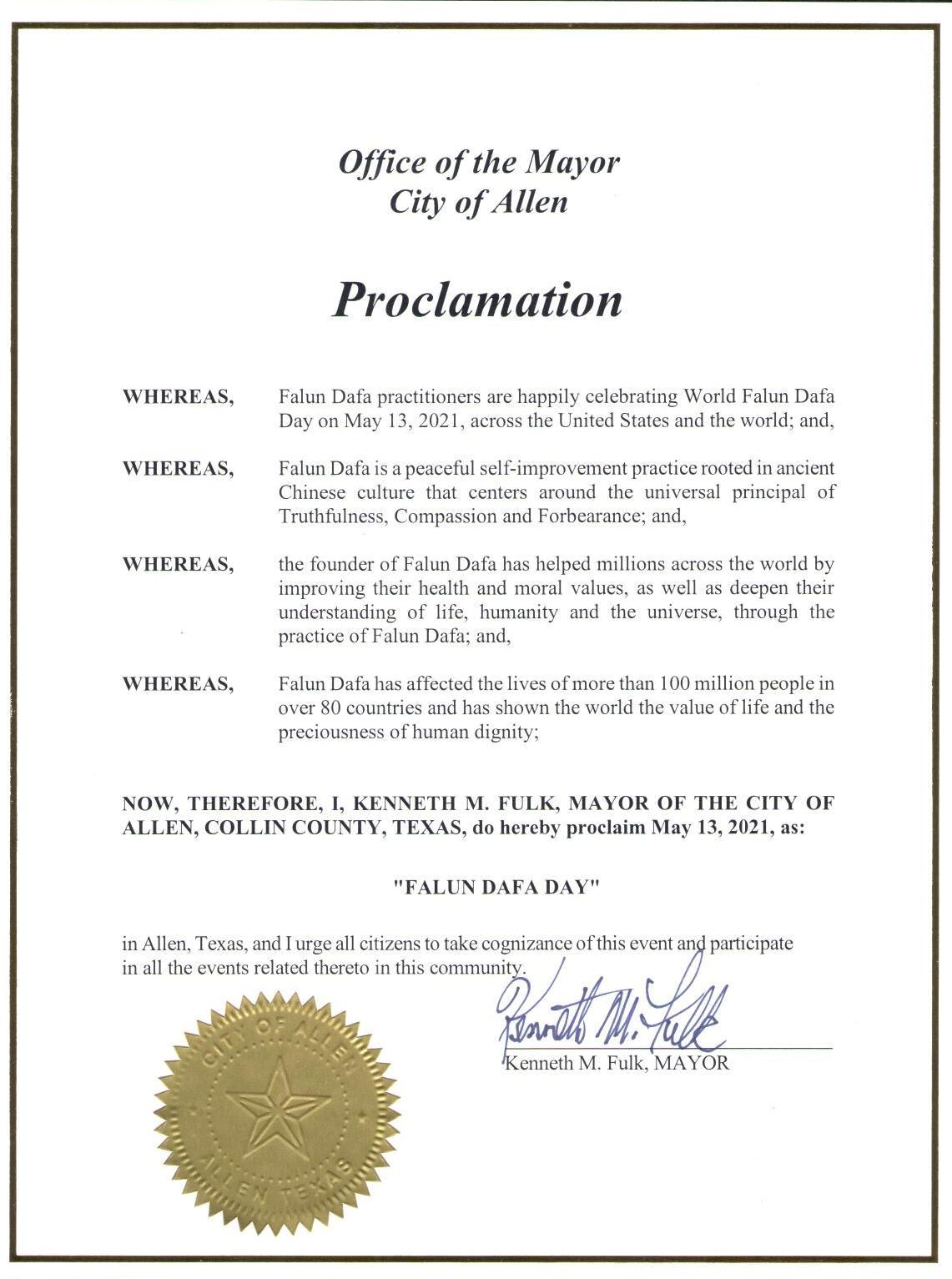 美國艾倫市(City of Allen)宣布「法輪大法日」