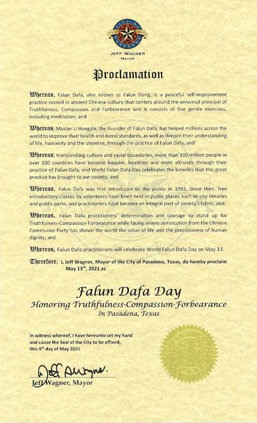 因此,我, 凱文﹒科爾 (Kevin Cole),作為德州梨園市長,特此宣布二零二一年五月十三日,為「世界法輪大法日」 。