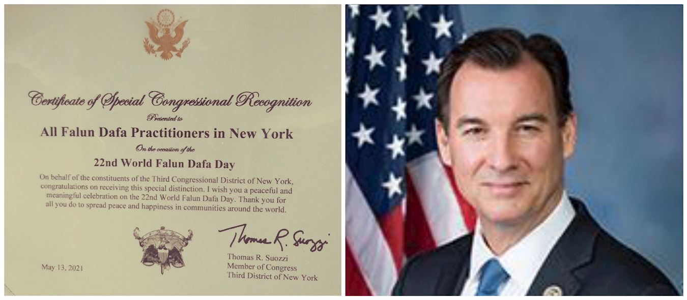 ![]() 圖4:紐約州第三選區國會議員托馬斯﹒蘇瑞(Thomas R. Suozzi)發來榮譽證書褒獎「法輪大法日」,祝願第二十一屆世界法輪大法日的慶祝活動,感謝法輪功學員把和平與幸福帶到世界各地。 |
