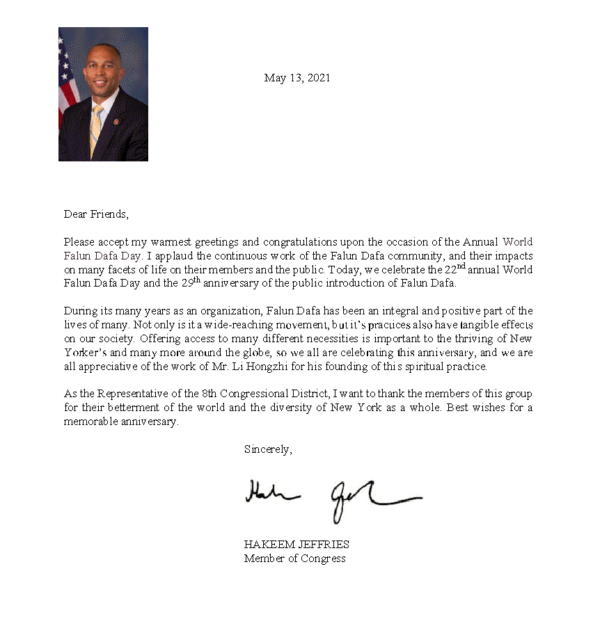 國會議員哈基姆﹒傑弗里斯(Hakeem Jeffries)在賀信中說:「在這一年一度的世界法輪大法日,請接受我最熱烈的問候和祝賀。」