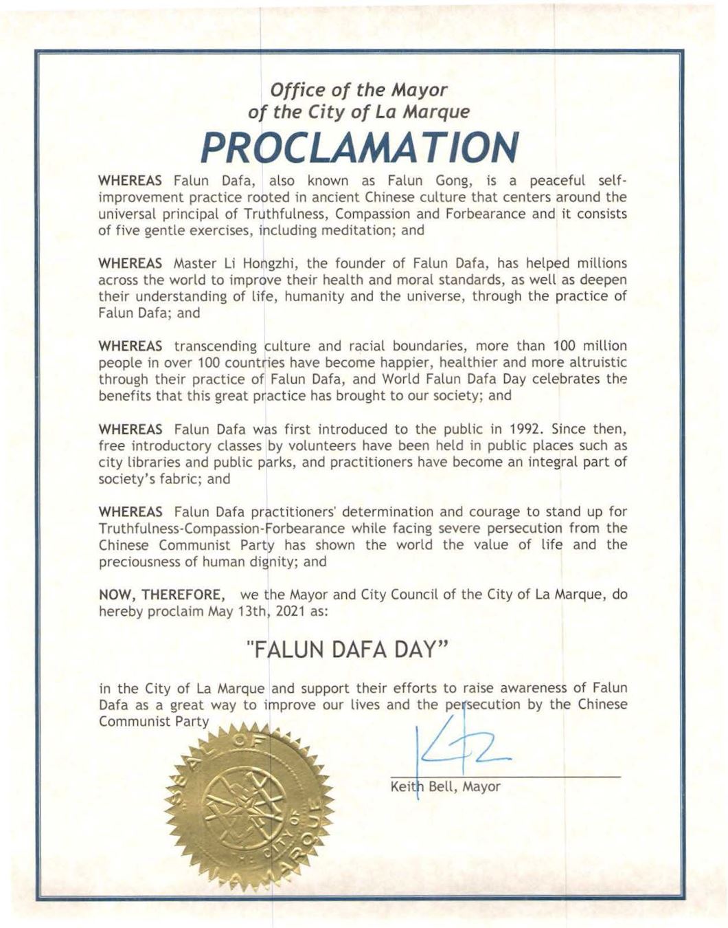 拉馬克市(La Marque)支持他們(法輪大法修煉者)的努力,以提高人們對法輪大法的認識,這是改善我們的生活、以及減少中共迫害的一種最佳途徑。