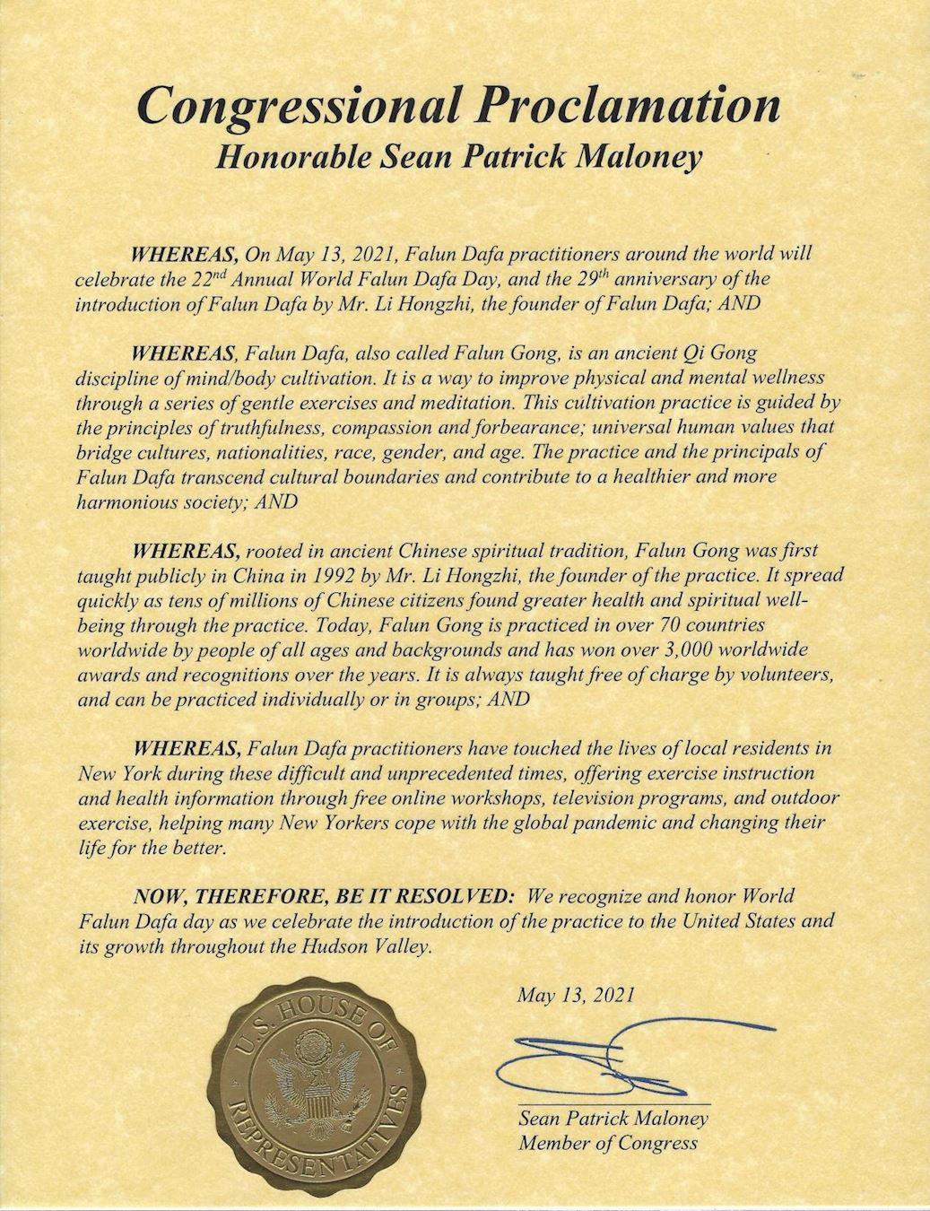 聯邦第十八選區國會議員肖恩﹒馬洛尼(Sean P. Maloney)發來褒獎,讚揚法輪大法為建立一個更健康、更祥和的社會做出了貢獻,讚揚法輪大法學員幫助許多紐約人應對全球瘟疫大流行並改善他們的生活,祝賀世界法輪大法日。