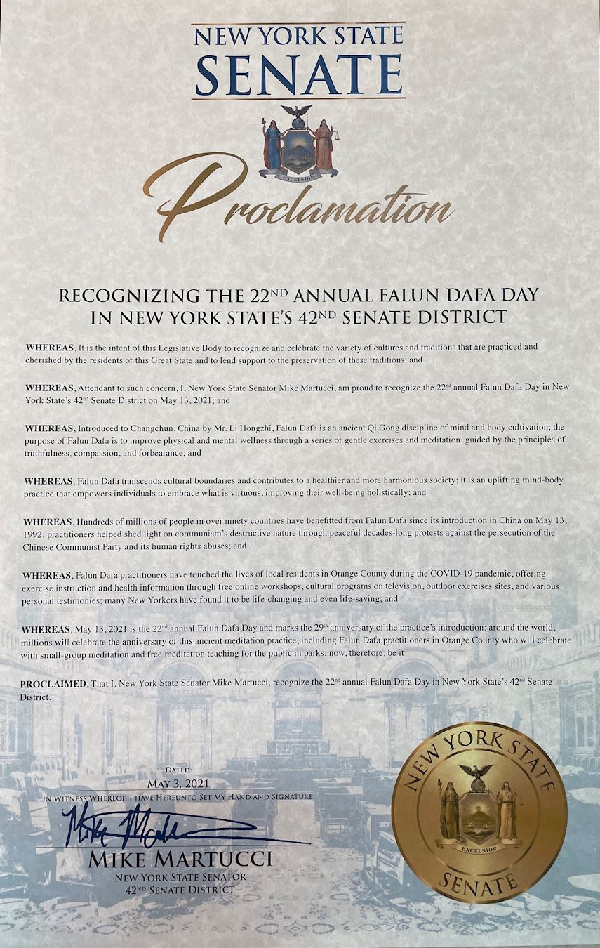 鑑於,對此關注的我,紐約州參議員邁克﹒馬圖奇(Mike Martucci),自豪地讚賞 2021年5月13日在紐約州第42參議院區舉行的第22屆法輪大法日;並且