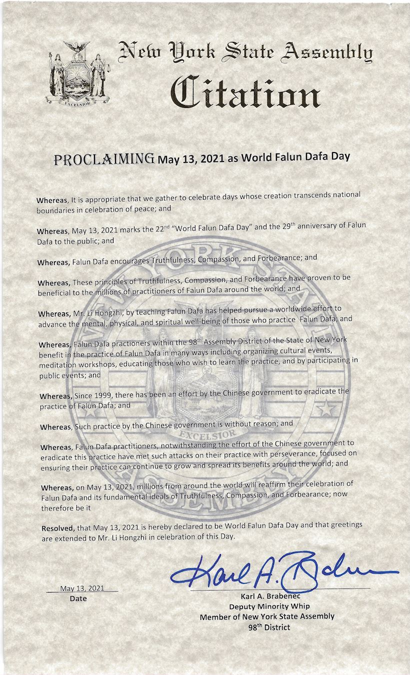 紐約州眾議院第九十八選區眾議員卡爾﹒布拉本尼克(Karl Brabenec),少數族裔領袖,發來褒獎,祝賀法輪大法日,宣布二零二一年五月十三日為「世界法輪大法日」,並向李洪志先生致以節日問候。褒獎令讚揚法輪功修煉者不接受中共的這種滅絕迫害,以對信仰的堅守應對這種攻擊,並使大法持續洪傳以造福全世界。