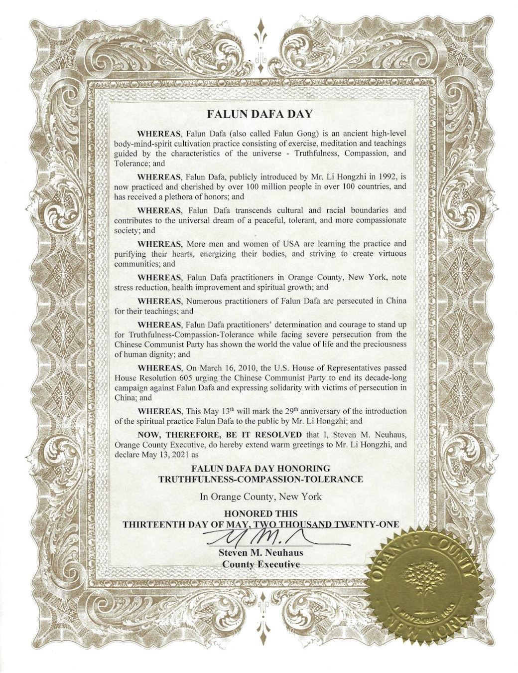 鑑此,我,紐約州橙縣(Orange County)縣長Steven M. Neuhaus, 特此決定,向李洪志先生致以熱情的問候,並宣告二零二一年五月十三日為紐約州橙縣法輪大法日,頌揚真、善、忍。