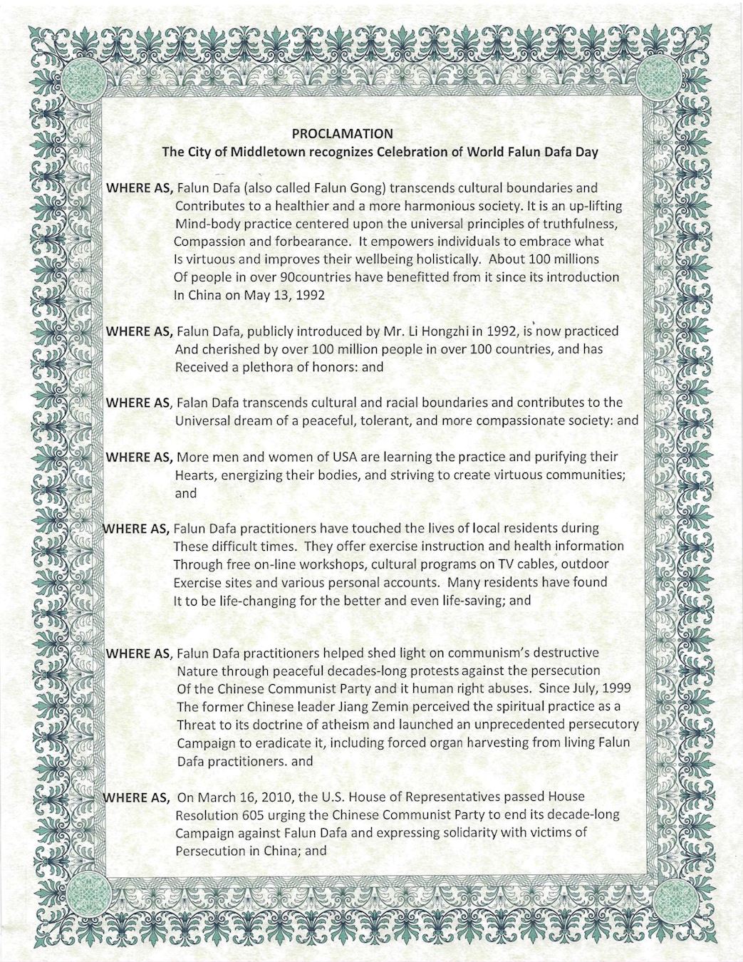 鑑於,法輪大法(又稱法輪功)超越文化和種族的界限,為建立一個祥和、忍讓且更加包容慈善的社會所做出的貢獻;法輪大法是上乘性命雙修功法,以真、善、忍宇宙特性為中心;他使修煉人能夠擁抱美德,並從整體上改善他們的福祉。自1992年5月13日在中國傳出以來,已有100多個國家的大約1億人受益;並且