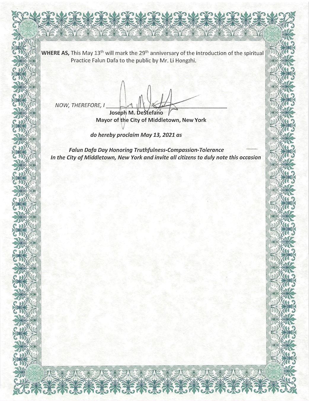 鑑此,我,紐約州米德爾敦市市長市長約瑟夫﹒德斯特法諾(Joseph M. DeStefano),特此宣告2021年5月13日為紐約州米德爾敦市法輪大法日,頌揚真、善、忍,並相邀所有市民關注此盛事。