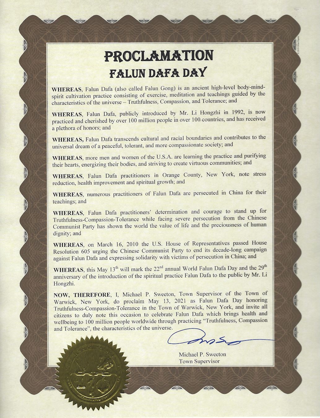 紐約州橙縣華威克鎮(Town of Warwick)鎮長邁克爾﹒斯威頓(Michael P. Sweeton)宣告二零二一年五月十三日為紐約州華威克鎮法輪大法日。