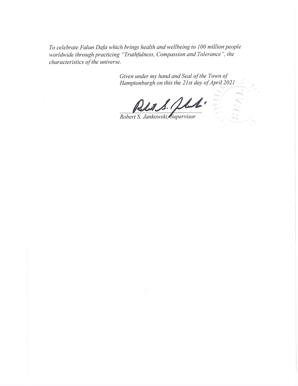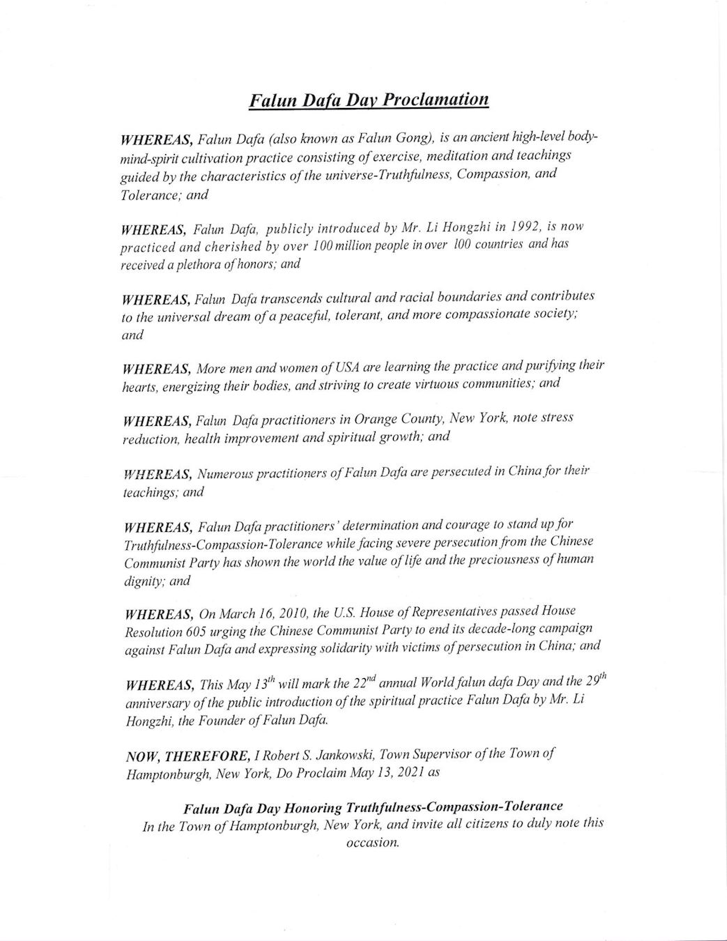 鑑此,我,紐約州Hamptonburgh鎮鎮長Robert S Jankowski,特此宣告二零二一年五月十三日為紐約州Hamptonburgh鎮法輪大法日,頌揚真、善、忍,並相邀所有市民屆時關注此盛事, 慶賀法輪大法給全世界上億人民通過實踐真、善、忍宇宙特性所帶來的健康和福份。