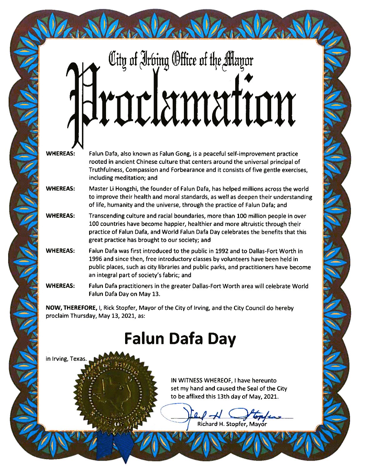 鑑此,我,市長里克﹒斯托弗(Rick Stopfer),歐文市市長和市議會,宣布二零二一年五月十三日為「法輪大法日」。