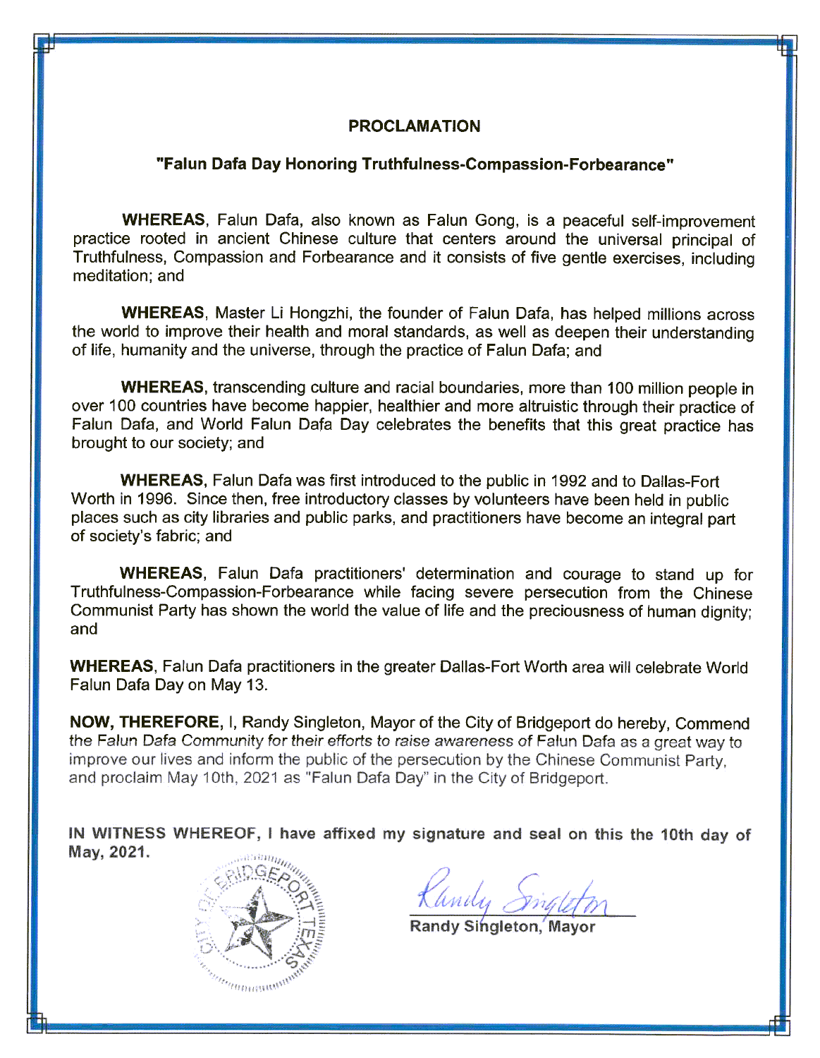 鑑此,我,蘭迪﹒辛格爾頓(Randy Singleton),布里奇波特市市長,讚揚法輪大法這個團體讓人們認識法輪大法是改善、提高人民生活的方法和告訴公眾中共的殘酷迫害,宣布二零二一年五月十日為布里奇波特市的法輪大法日。