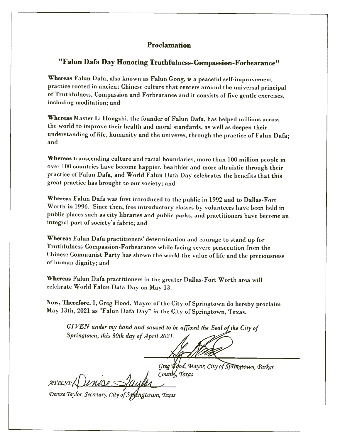 鑑此,我,格雷格﹒胡德(Greg Hood),春城市市長,宣布二零二一年五月十三日為春城市的法輪大法日。