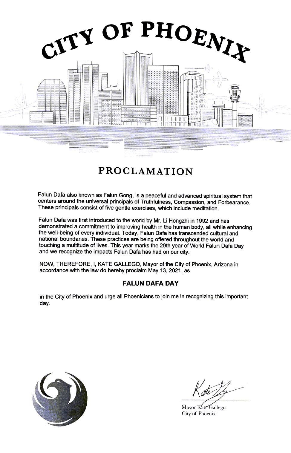 因此,我,凱特﹒加列戈(Kate Gallego),作為亞利桑那州鳳凰城市長,在此宣布二零二一年五月十三日為法輪大法日。