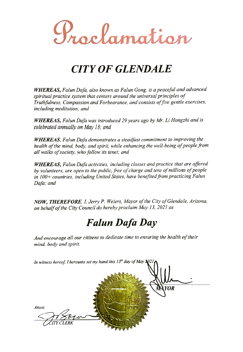 現在,因此,我,傑瑞﹒威爾士(Jerry Weiers),作為亞利桑那州格蘭岱爾市市長,代表市議會,在此宣布二零二一年五月十三日為法輪大法日。