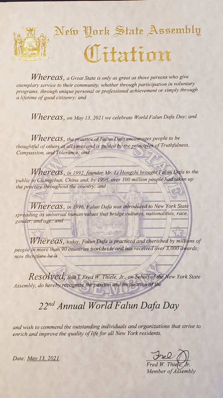 謹此決議,我,小弗雷德﹒W﹒蒂勒(Fred W. Thiele,Jr.)代表紐約州議會,祝賀第二十二屆世界法輪大法日並要讚揚那些致力於豐富和改善所有紐約居民生活質量的傑出個人和組織。