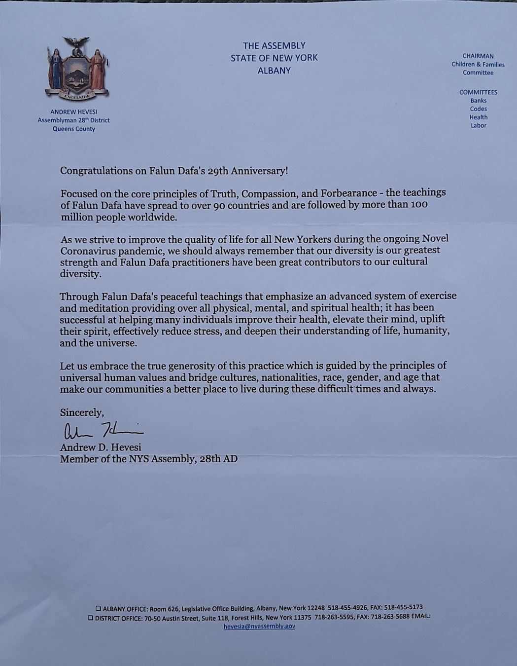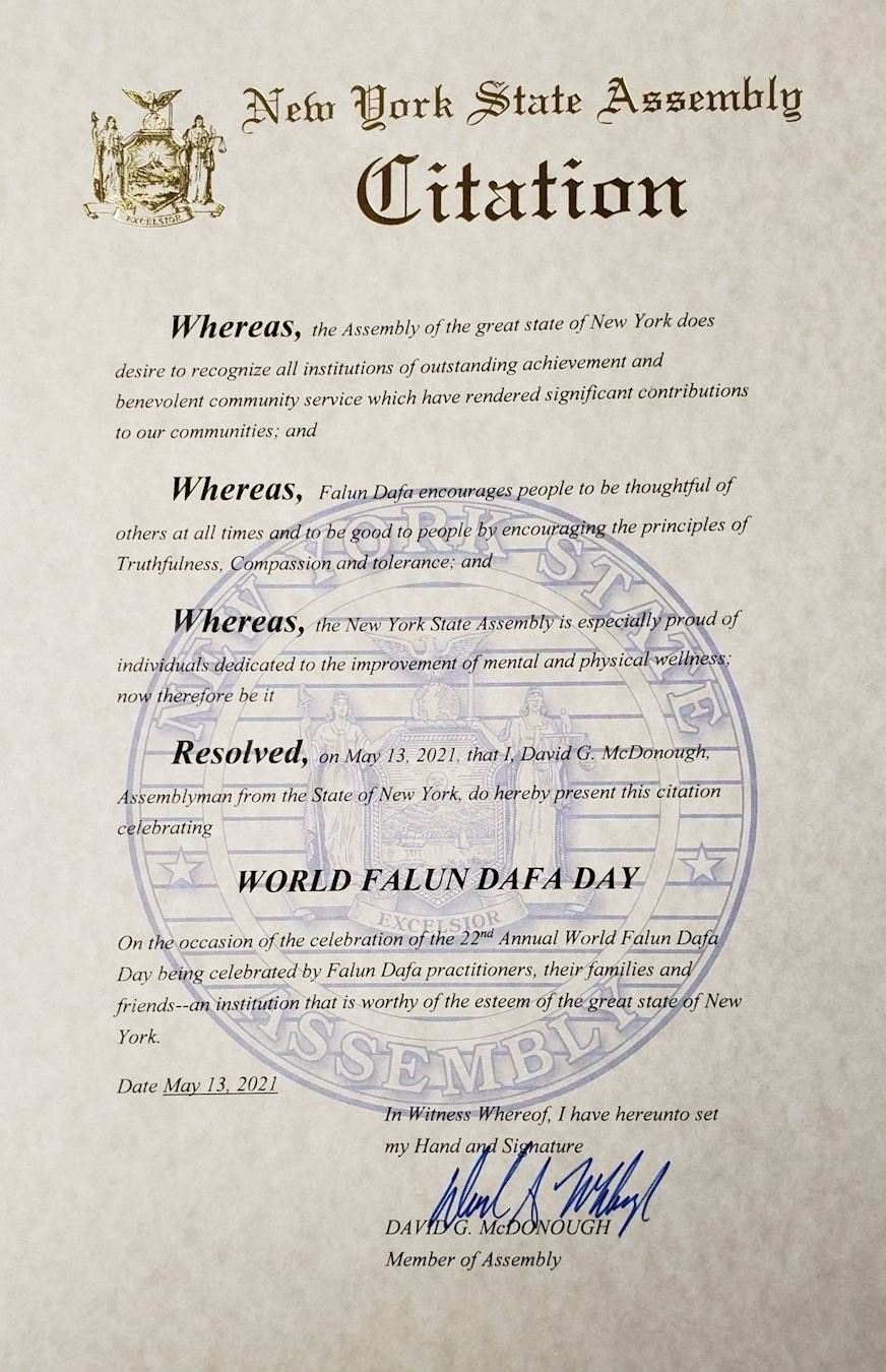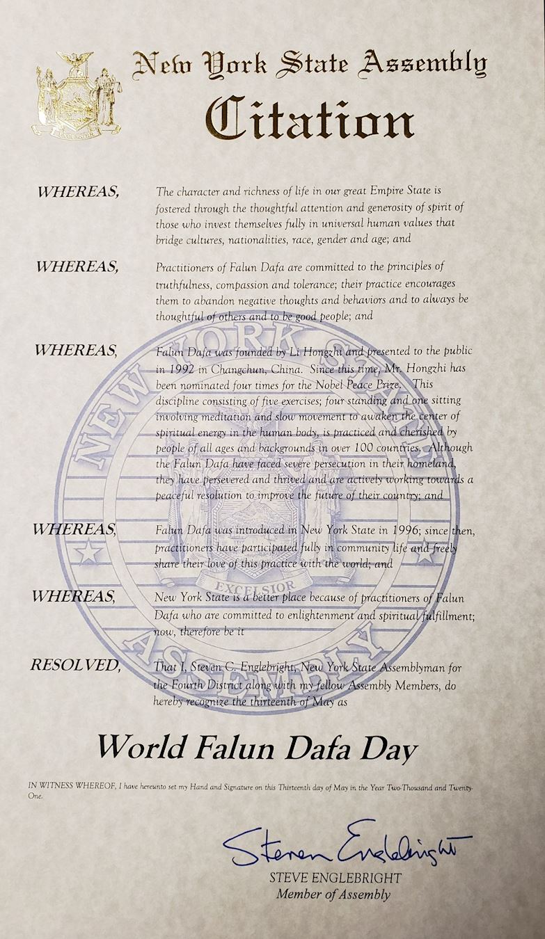 茲決定,作為紐約州議會的正式當選議員,我讚揚世界法輪大法日為社區提供的熱誠服務,慶祝活動非常出色,值得我們社區和偉大的紐約州的尊敬。