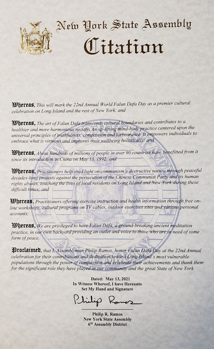 我,菲利普﹒拉莫斯議員,在第二十二屆法輪大法日的慶祝活動上慶賀法輪大法日,感謝他們通過慈悲的力量對長島最弱勢人群的貢獻和奉獻,慶祝他們的成就,感謝他們在我們社區和偉大的紐約州發揮的重要作用。