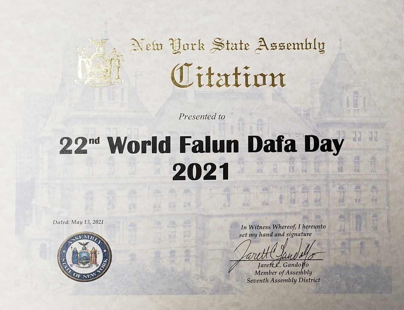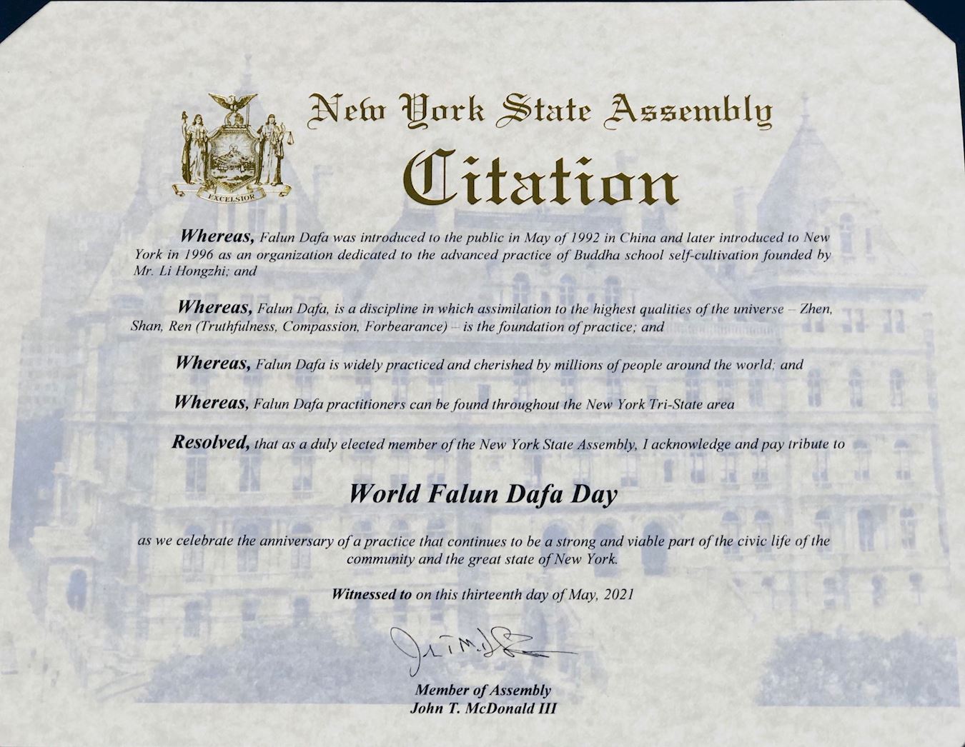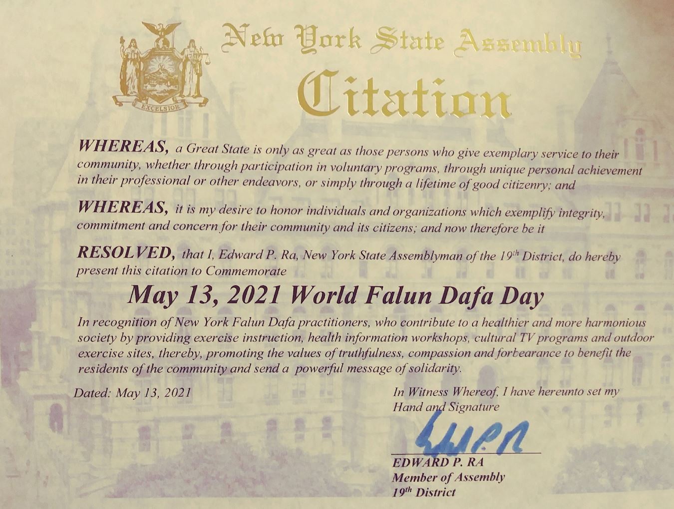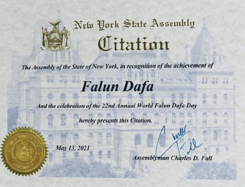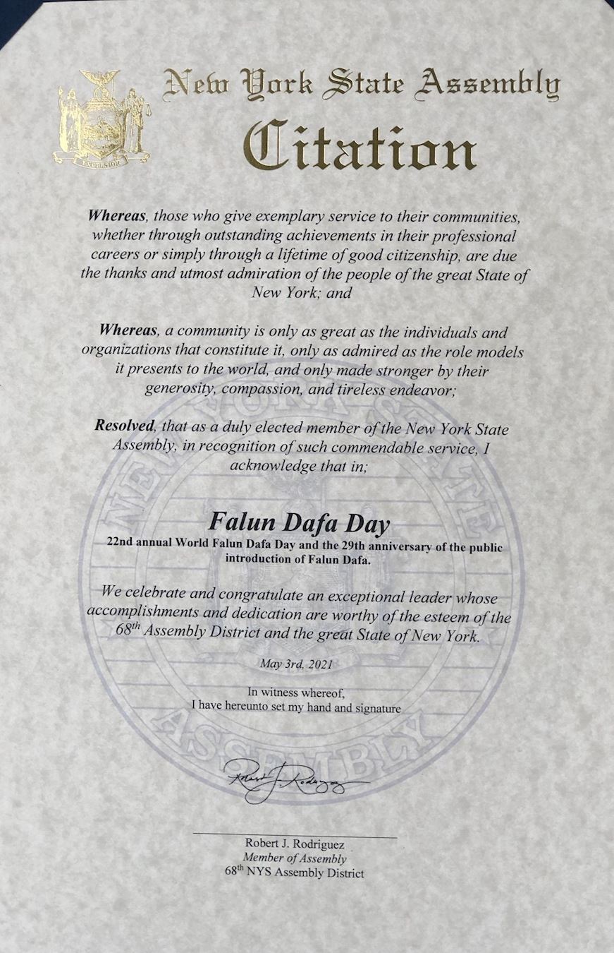 在此,作為紐約州眾議院成員,我認證並向世界法輪大法日致以敬意
