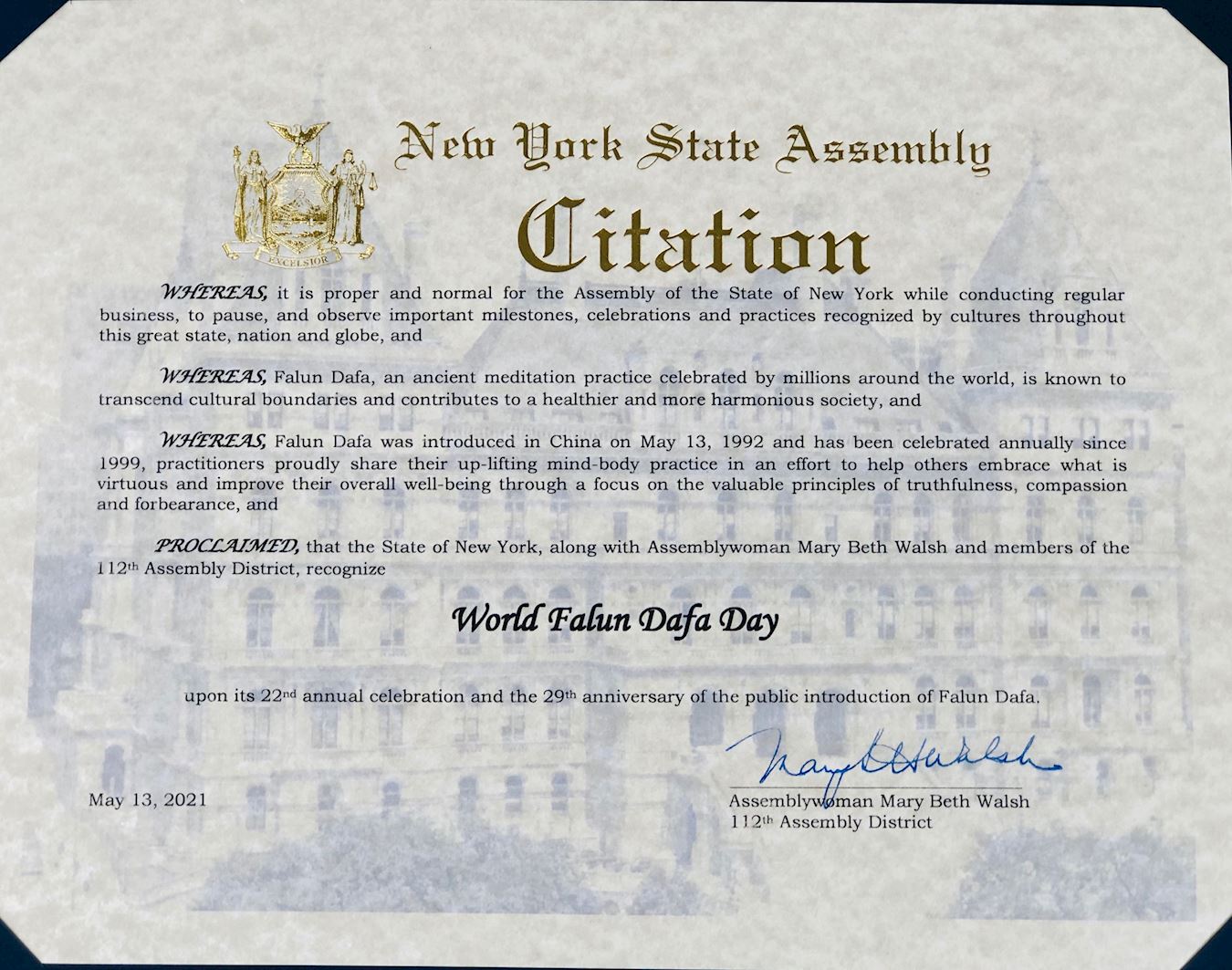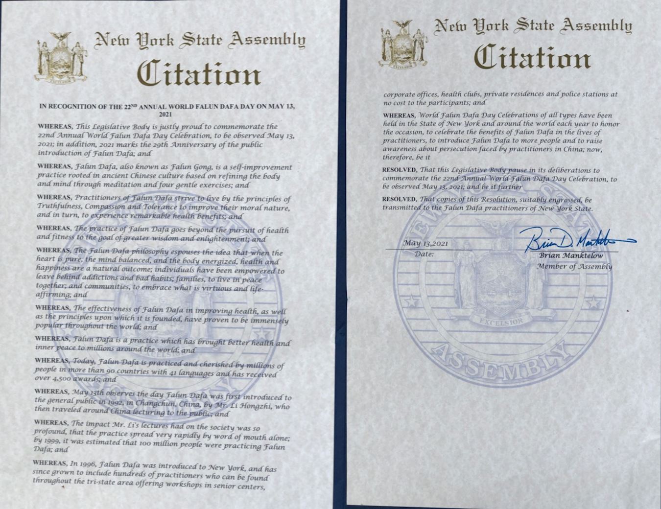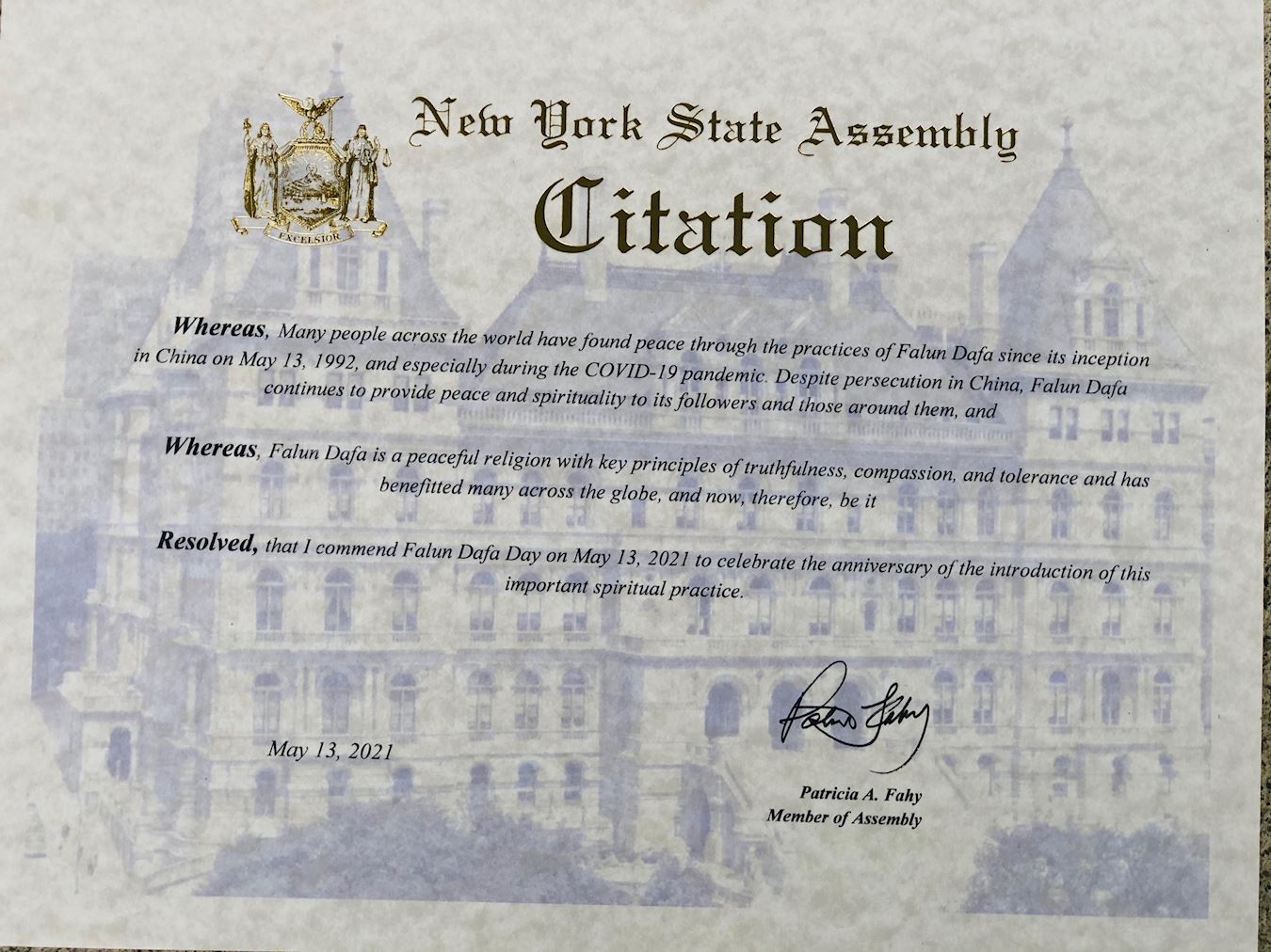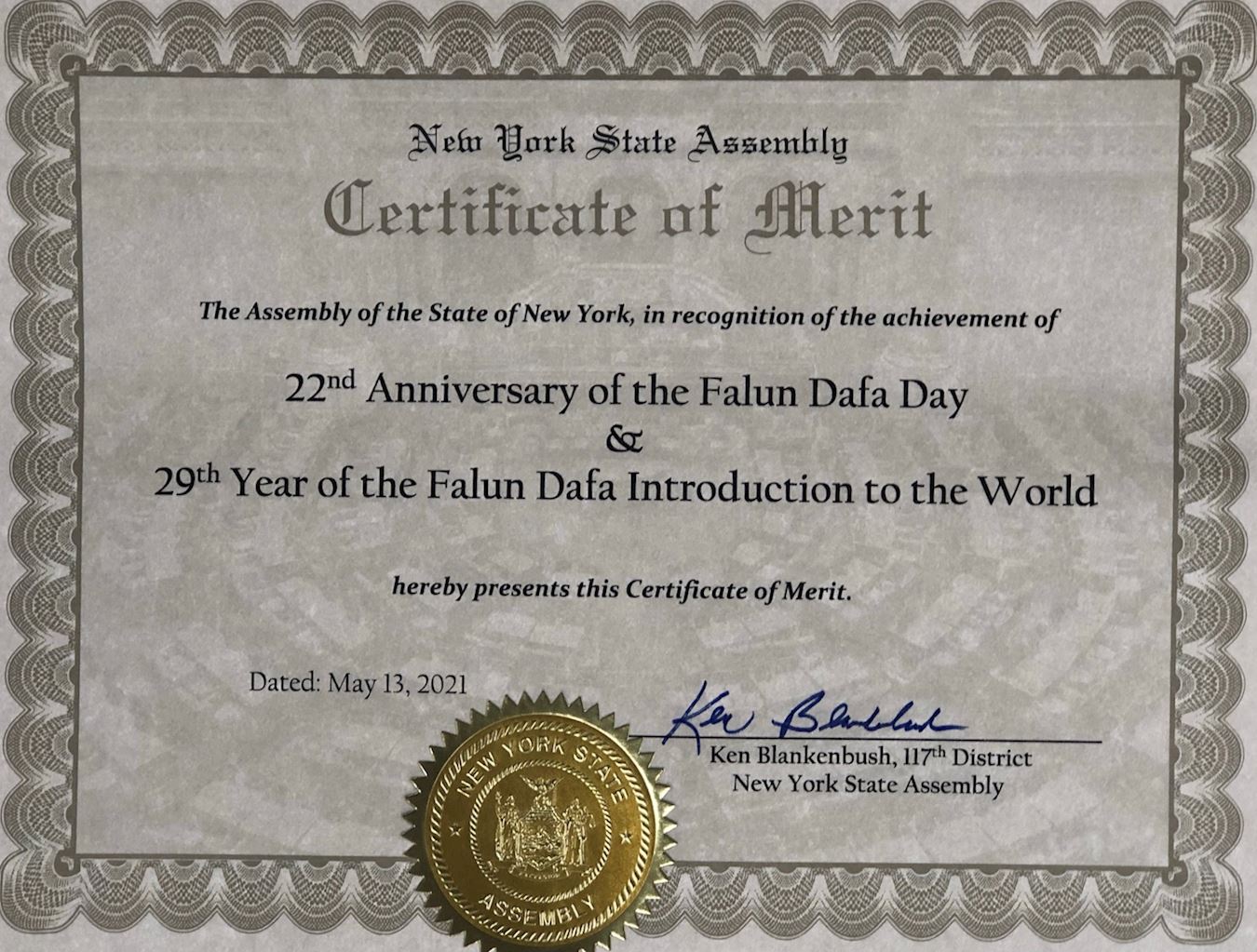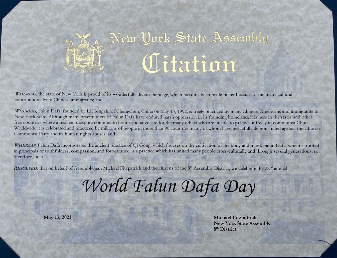 在此,作為紐約州眾議院成員,我認證並向世界法輪大法日致以敬意