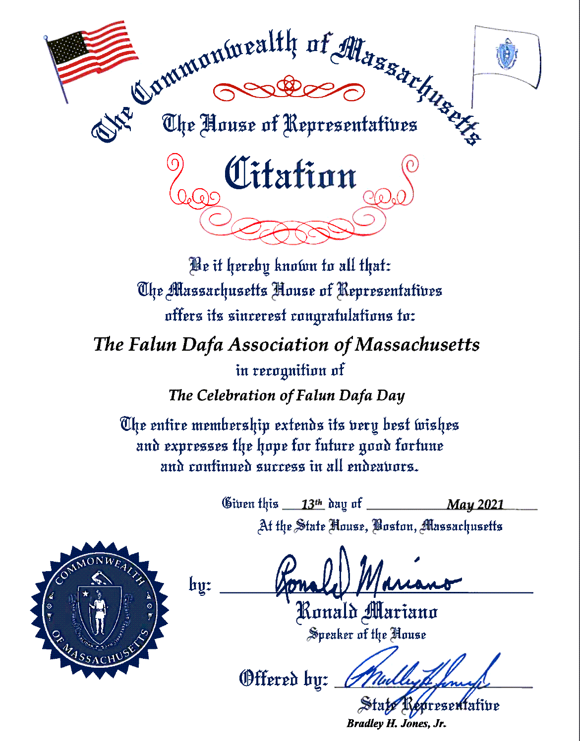 謹在此公布:麻薩諸塞州眾議院向新英格蘭法輪大法學會致以法輪大法日的真誠祝賀。全體議員向 你們傳達最佳祝福,希望諸事好運,持續成功。