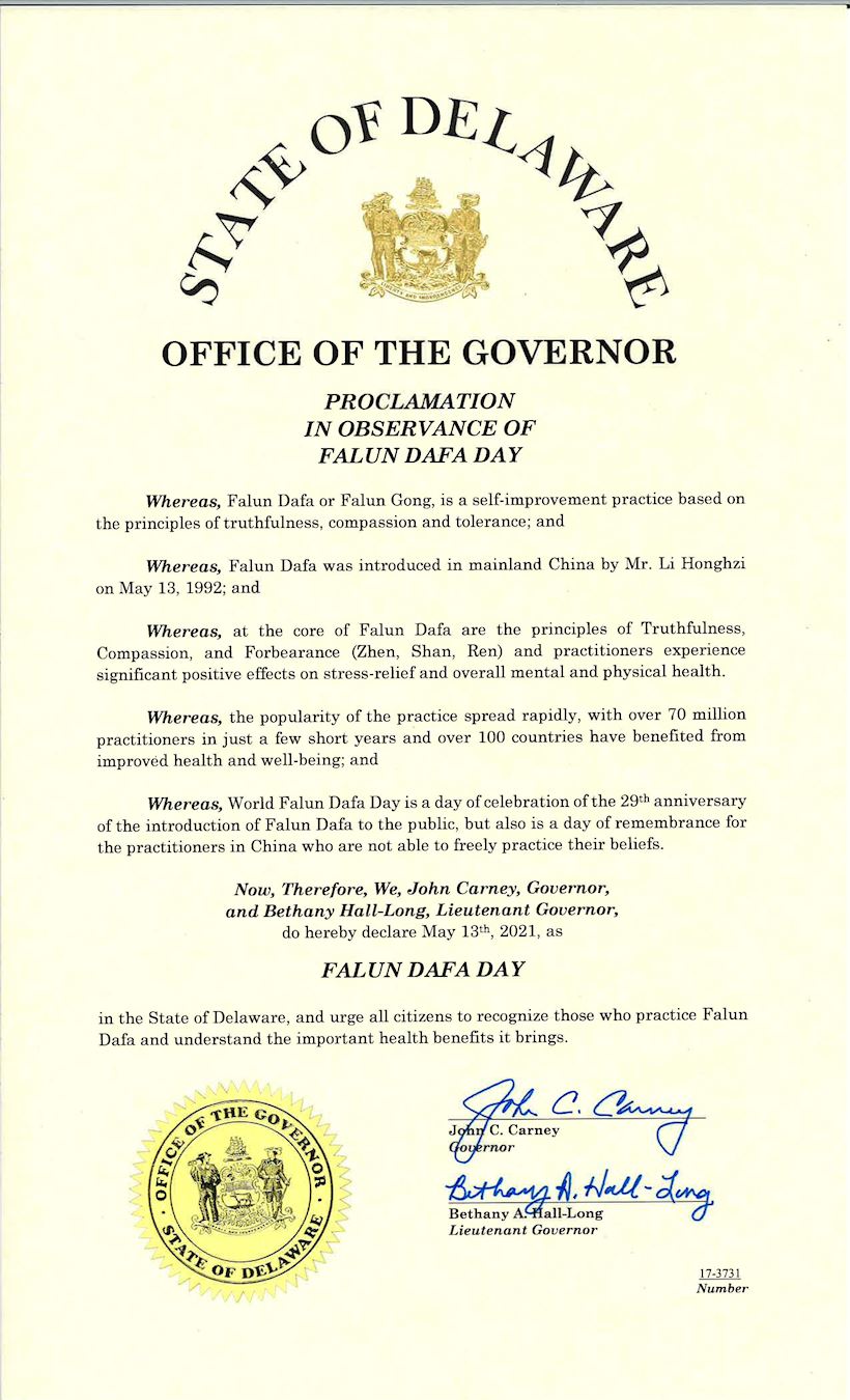 因此,我們,德位華州長約翰﹒卡尼(John Carney)和副州長伯大尼﹒赫隆(Bethany Hall-Long),在此宣布2021年5月13日為特拉華州法輪大法日。我們也希望大家一起來支持法輪大法修煉者並了解這項功法在增進健康上的益處。