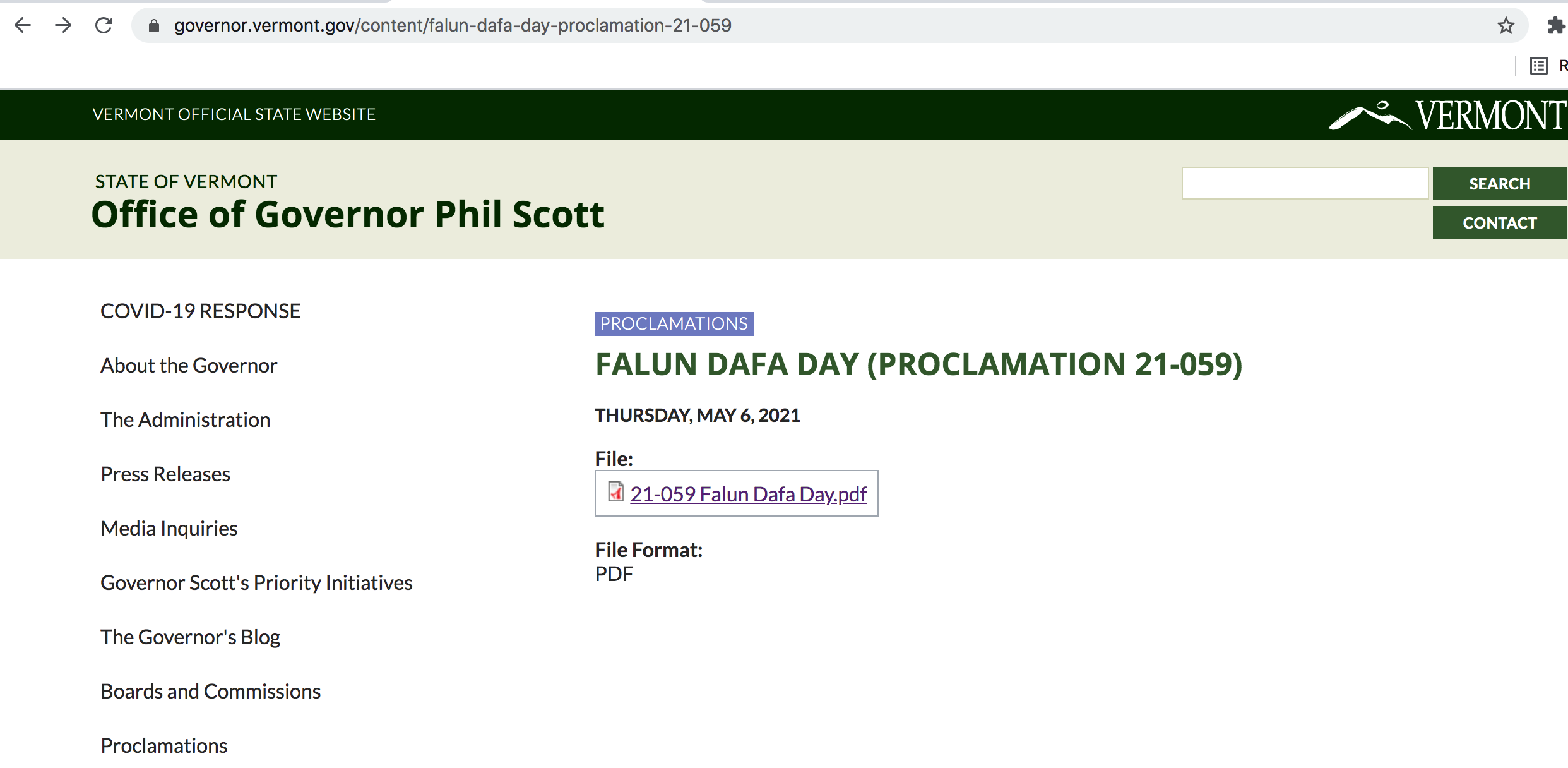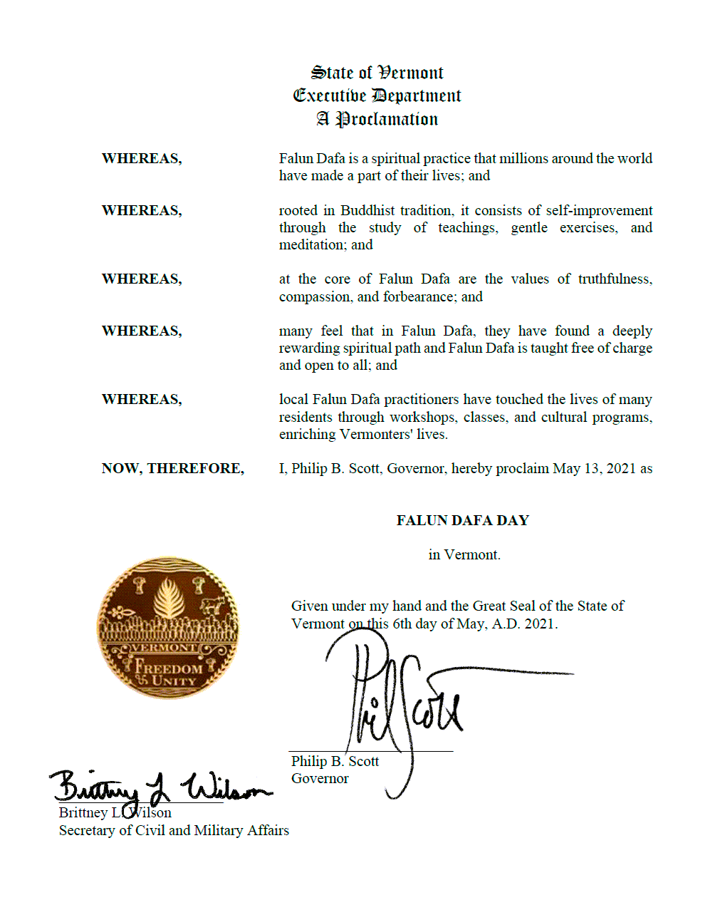 因此,我,菲利浦﹒斯科特,州長,在此宣布2021年5月13日是佛蒙特州的法輪大法日。