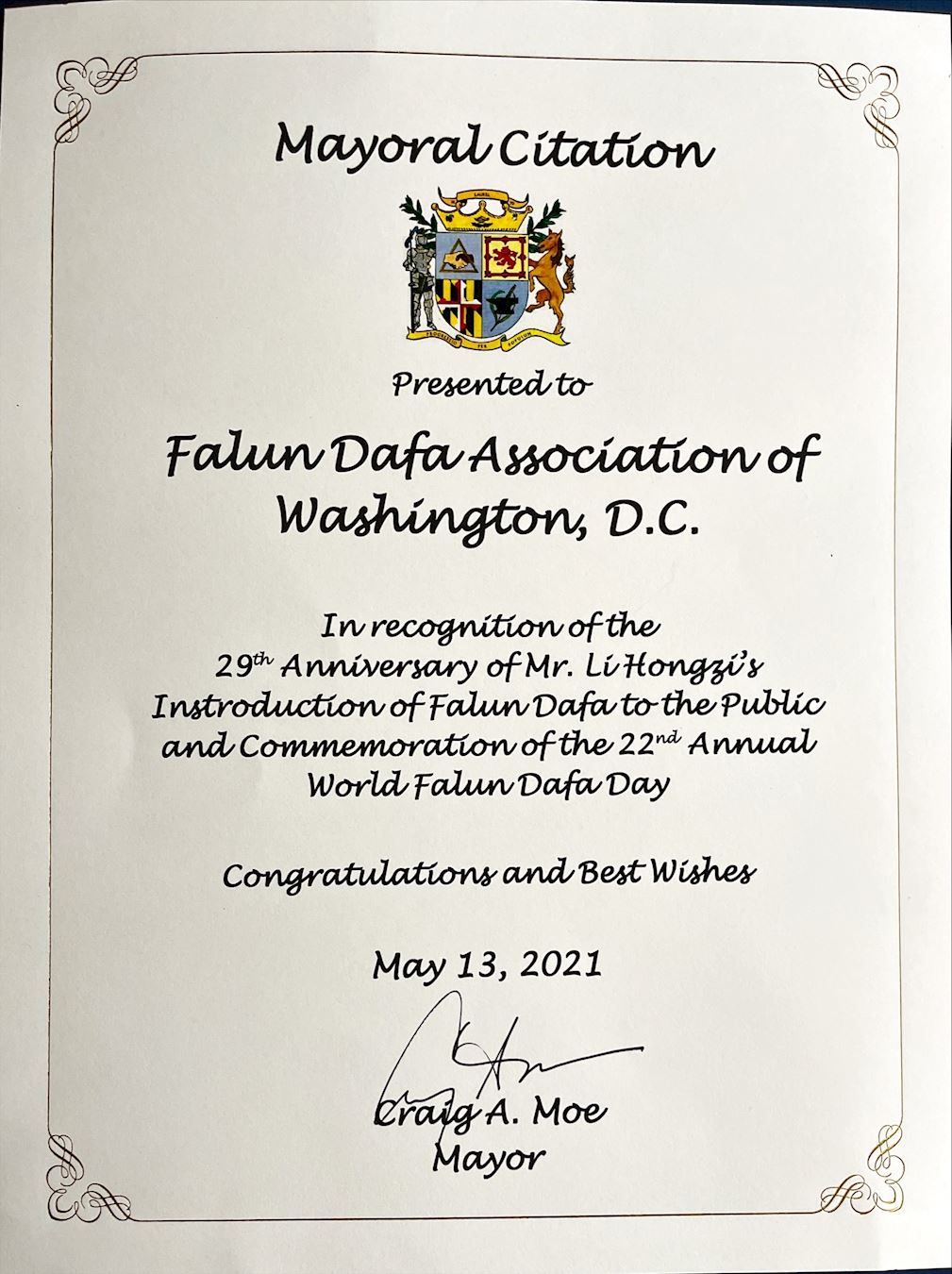 以表彰李洪志先生將法輪大法公開傳出二十九週年,並紀念第二十二屆世界法輪大法日。