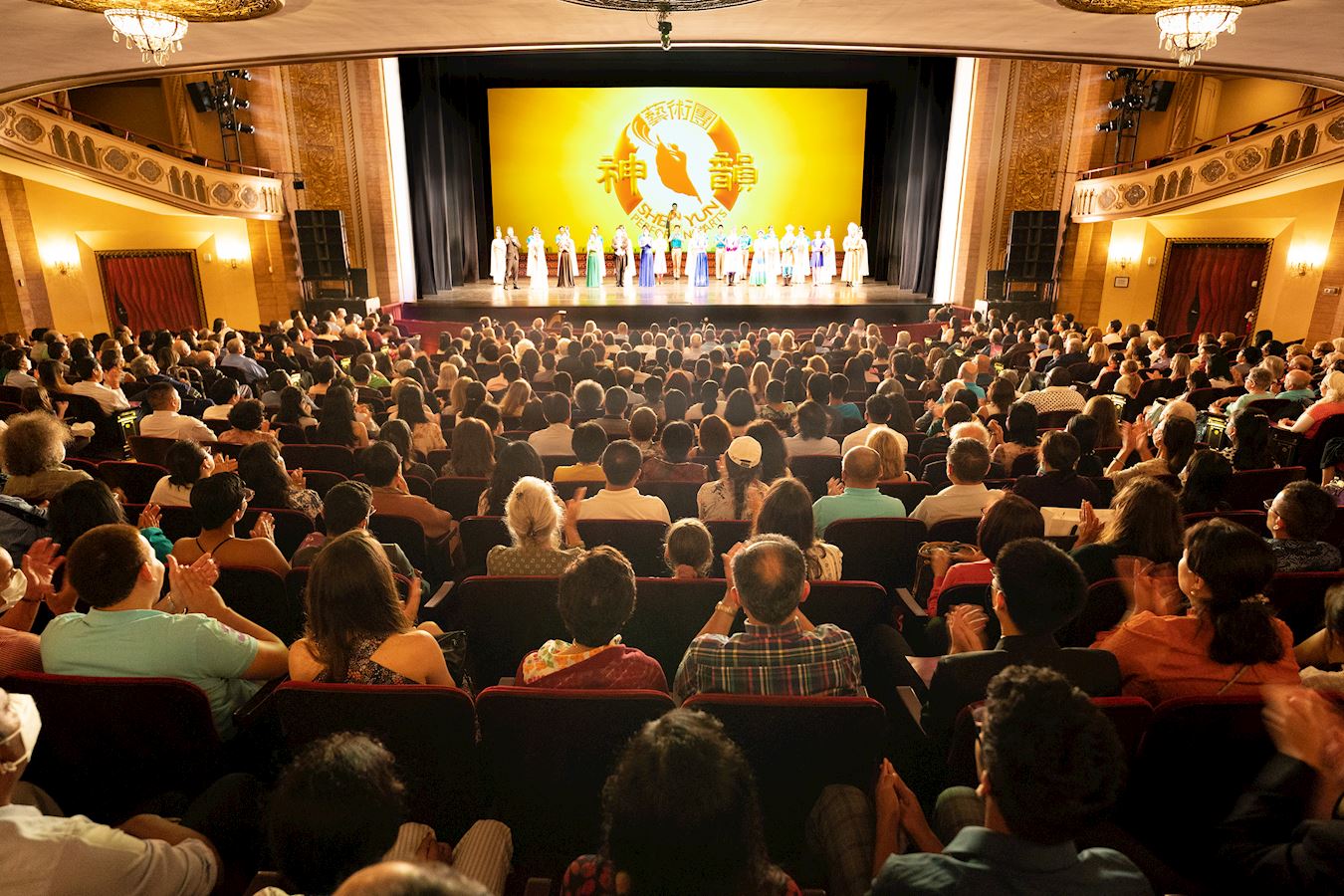 ![]() 圖1:神韻紐約藝術團二零二一年七月二十五日在康州斯坦福派雷斯劇院(The Palace Theatre)演出。演員在雷動掌聲中謝幕。 |
