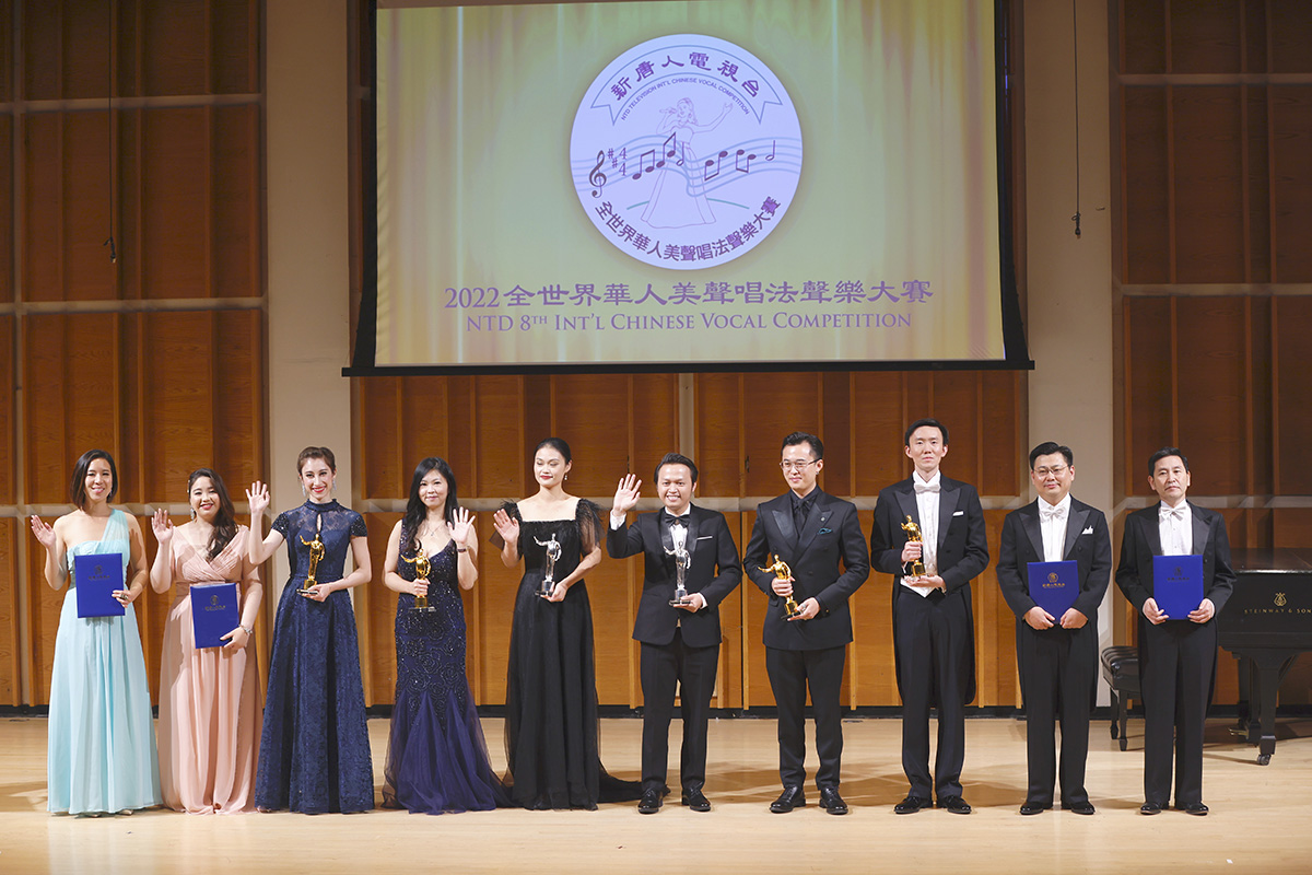 圖1:二零二二年十月二日,第八屆新唐人「全世界華人美聲唱法聲樂大賽」決賽在紐約曼哈頓考夫曼音樂中心莫肯演奏廳(Merkin Hall of Kaufman Music Center)落幕。圖為獲獎選手合影。(大紀元)