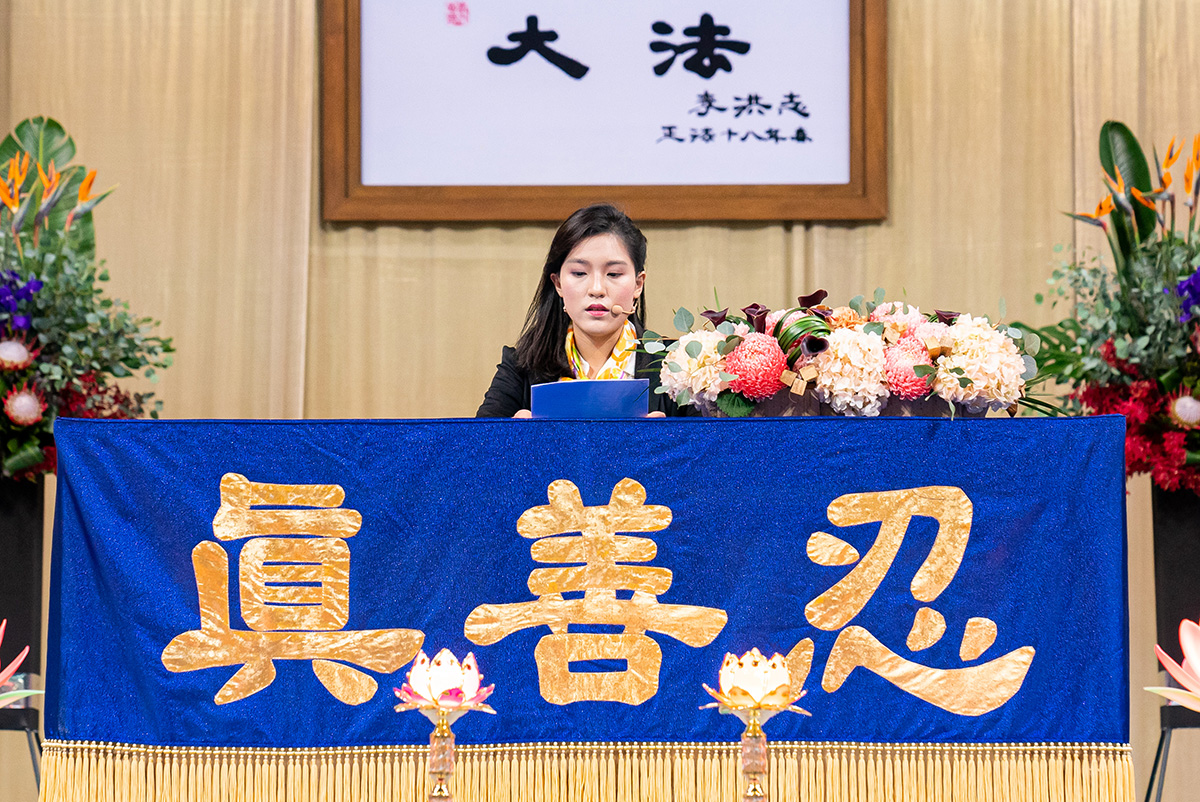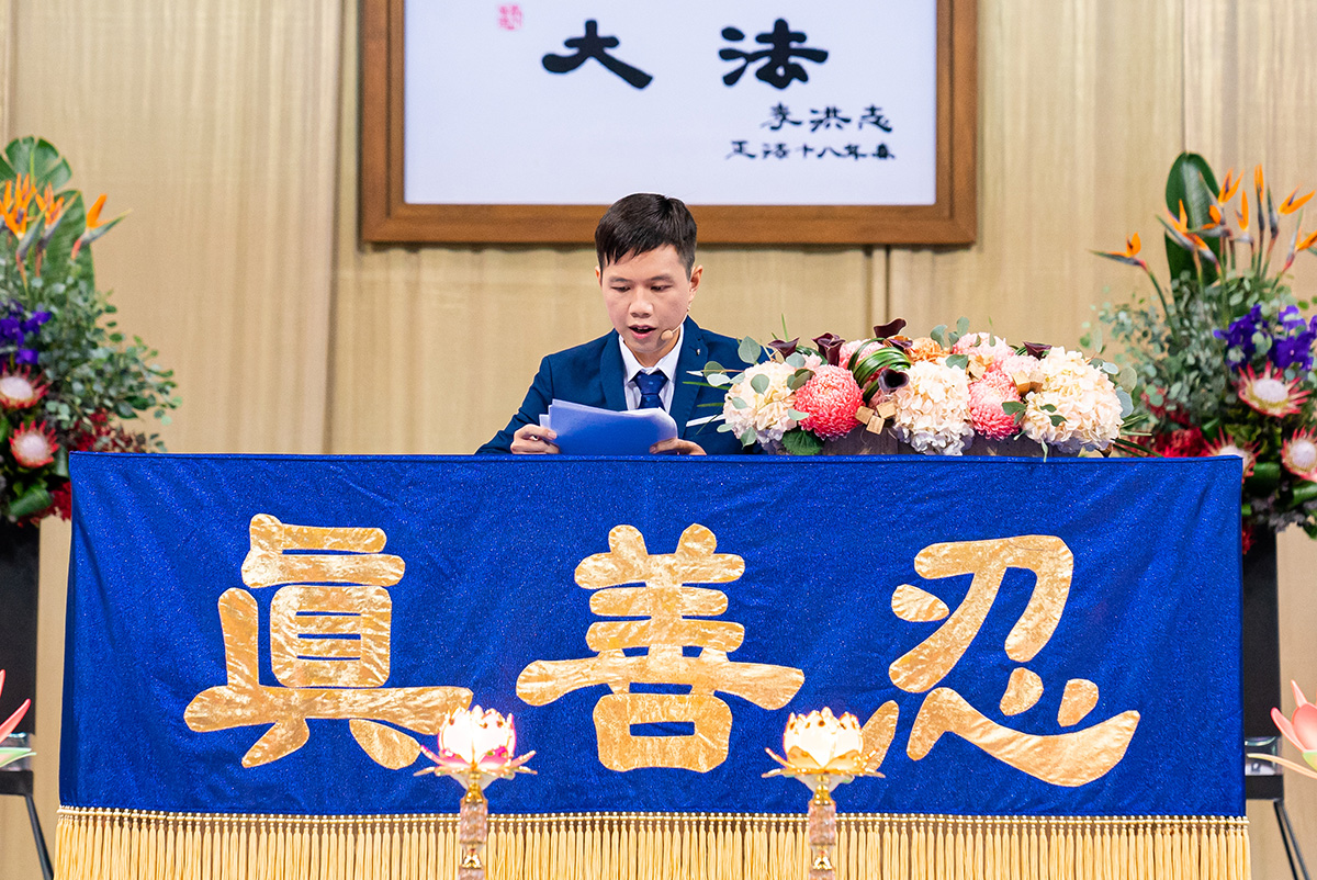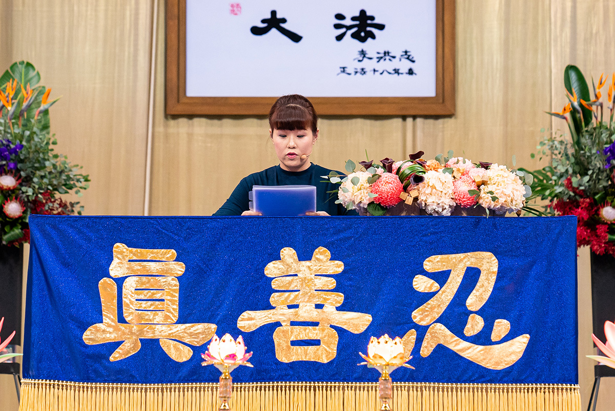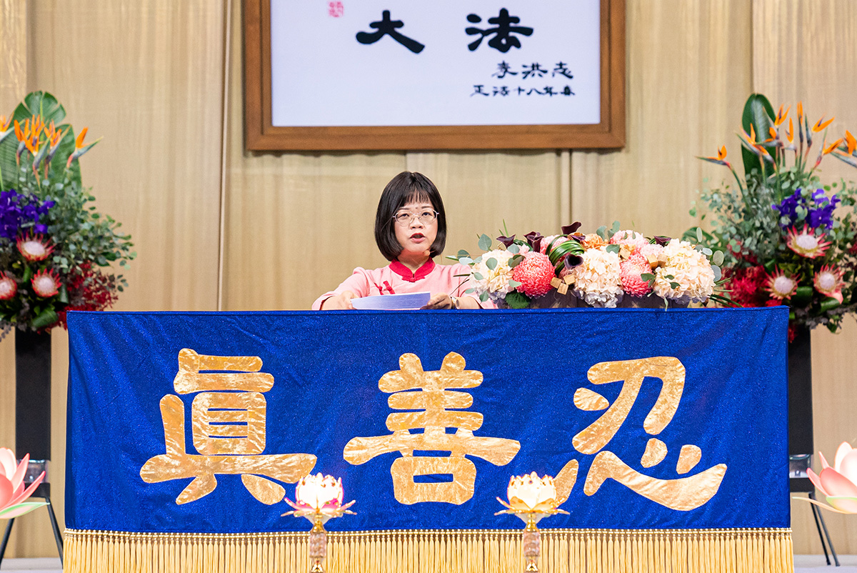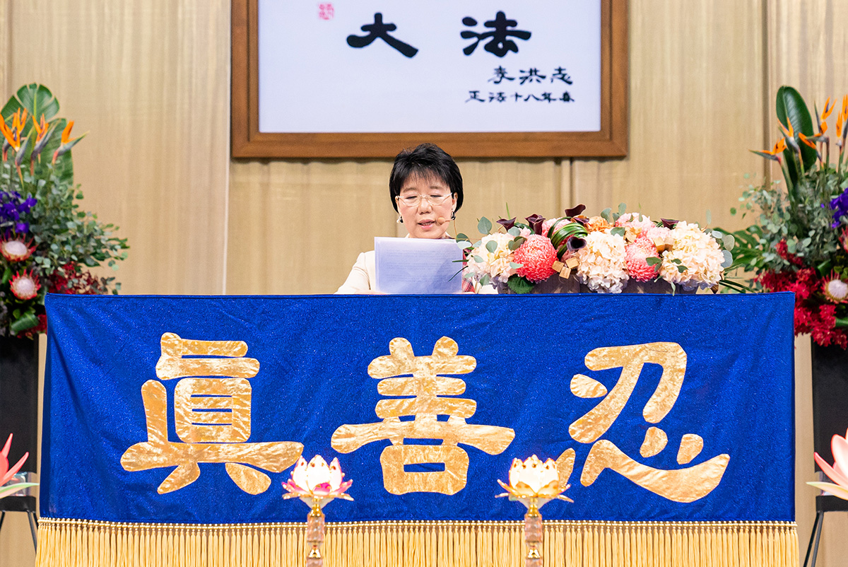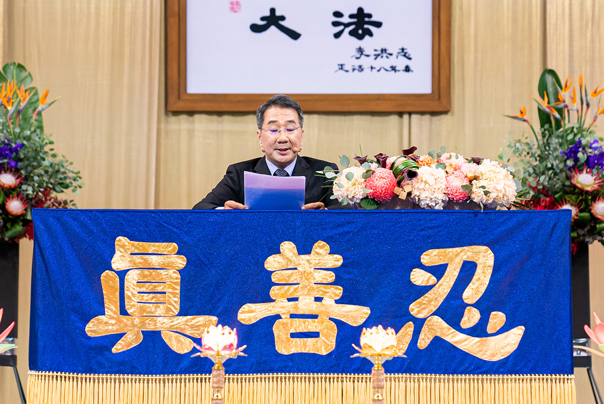 主席台正中央高掛李洪志師父法像與「真善忍」、「法輪常轉」兩面法輪圖形;師尊詞句「慈悲能溶天地春 正念可救世中人」[1]高懸兩側,多面印著《洪吟》中的詩詞橫幅環繞全場,會場氣氛殊勝莊嚴。這次法會共有十九位學員發言,交流他們在修煉中內找自己、實修心性、用心救人的體悟,深深觸動每一位在場的學員。
