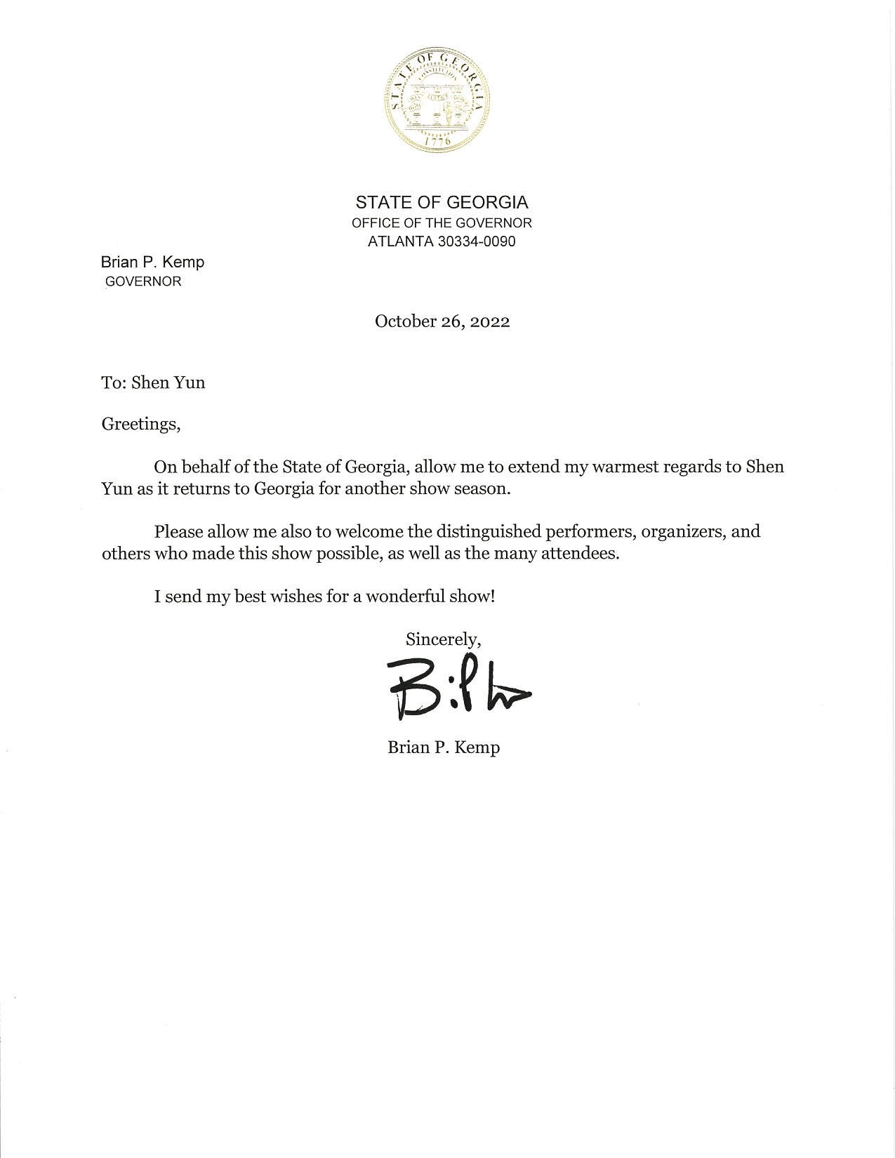 美國喬治亞州州長布萊恩﹒坎普(Brian Kemp)於二零二二年十月二十六日致函道:「謹代表喬治亞州全體居民,在神韻再度蒞臨喬治亞州之際,讓我向神韻致以最熱忱的問候。」