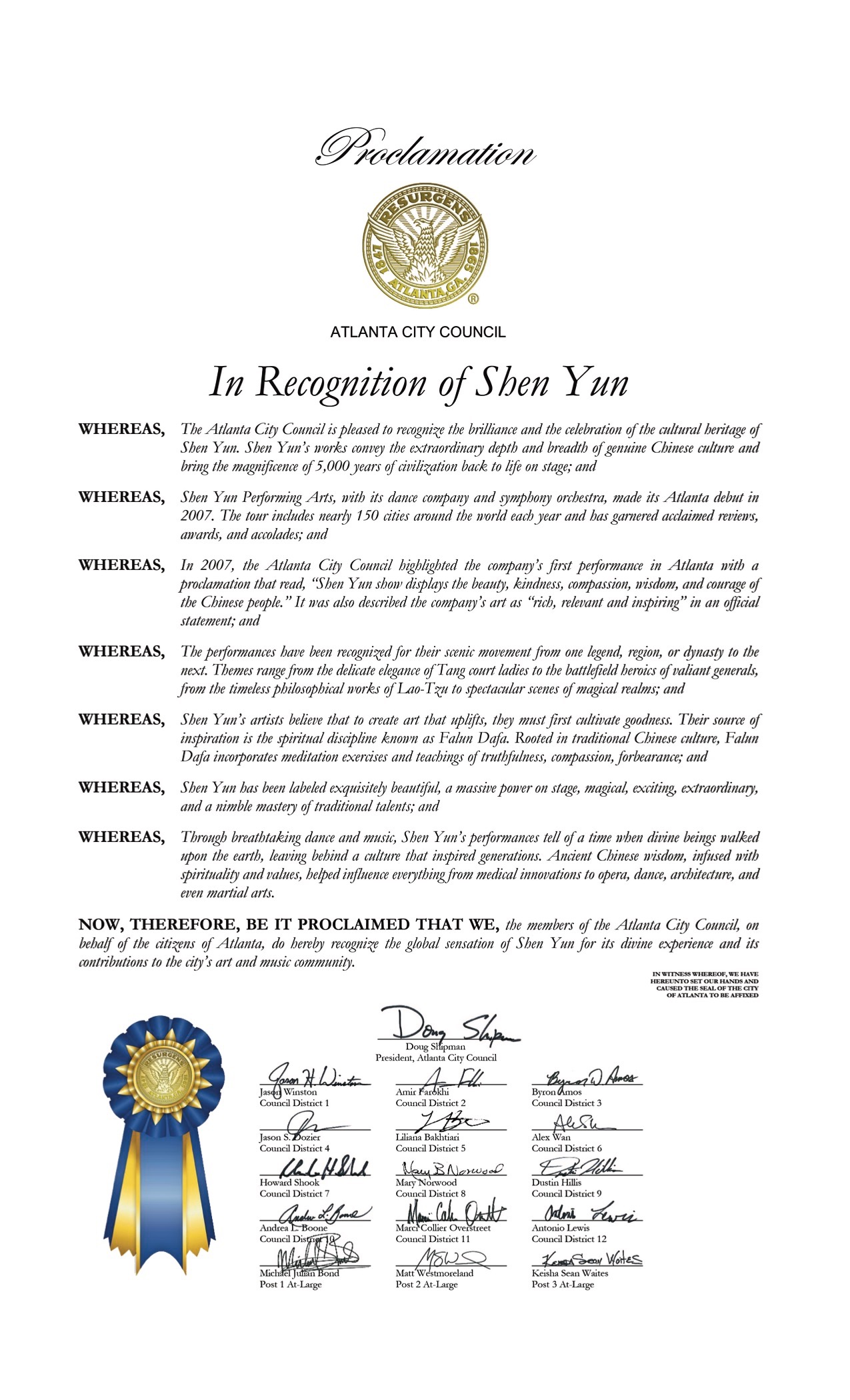 這不是亞特蘭大市議會第一次給神韻褒獎,褒獎中說:「早在二零零七年,亞特蘭大迎接神韻第一次來此時,市議會頒發的褒獎就表示『神韻演出展現了中華民族優美、仁慈、慈悲、智慧與勇氣的品質』,並且正式聲明神韻的藝術內涵『豐富、重要,又具啟發性』。」