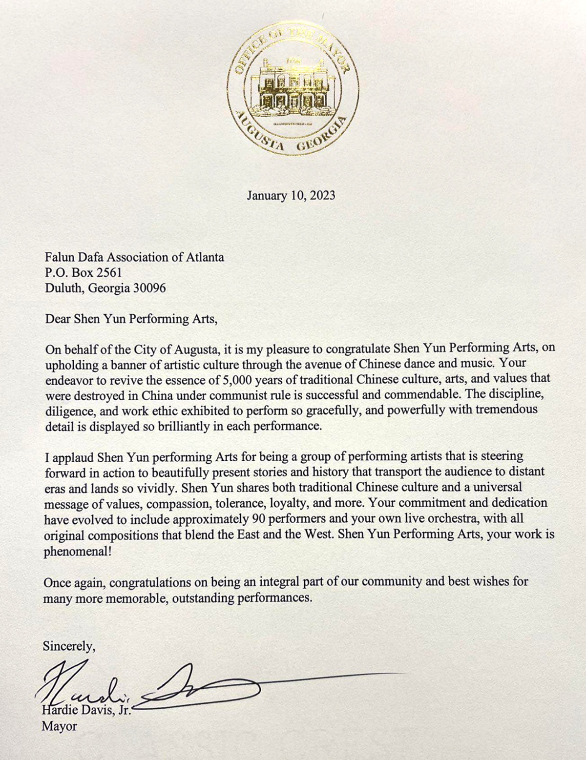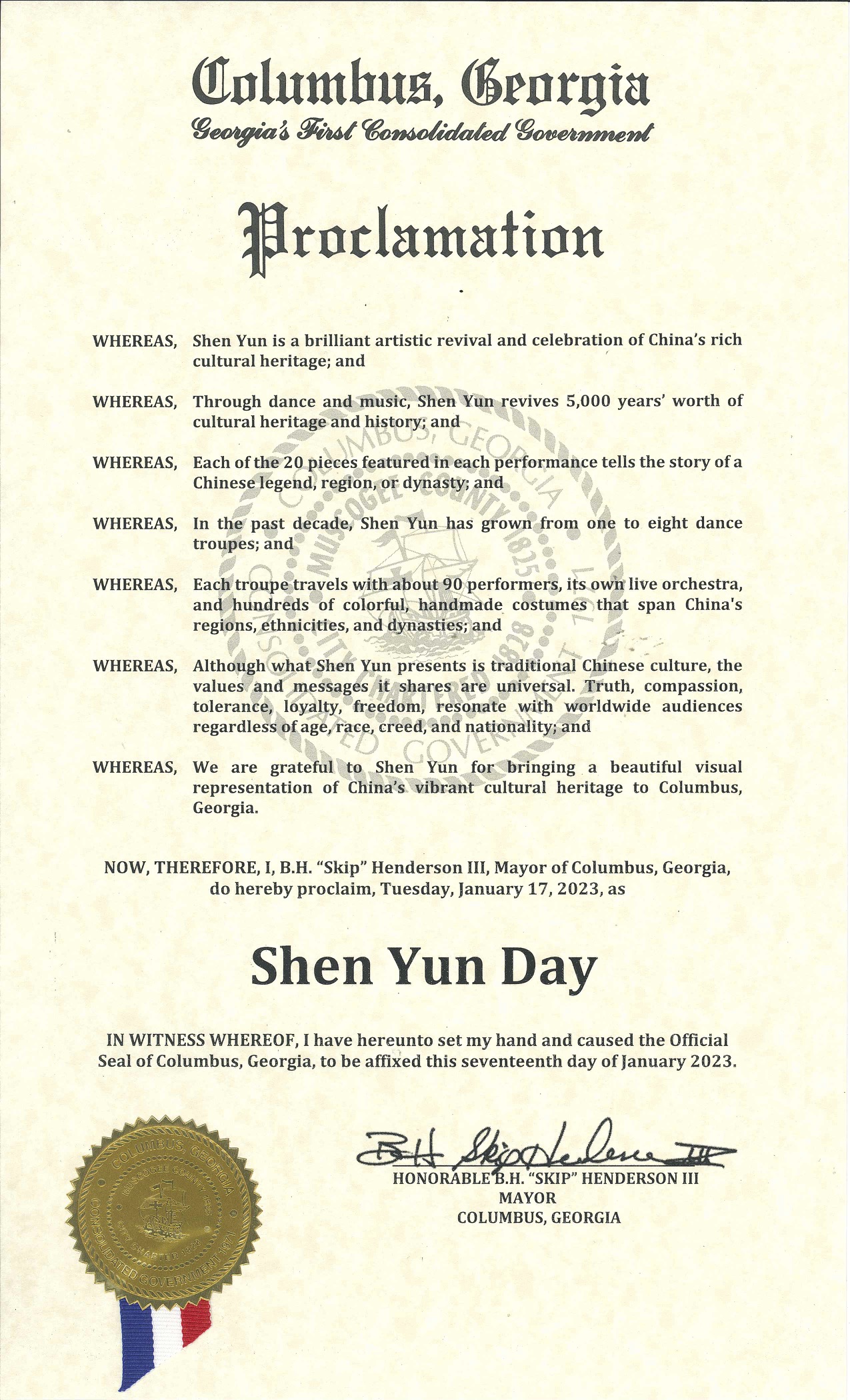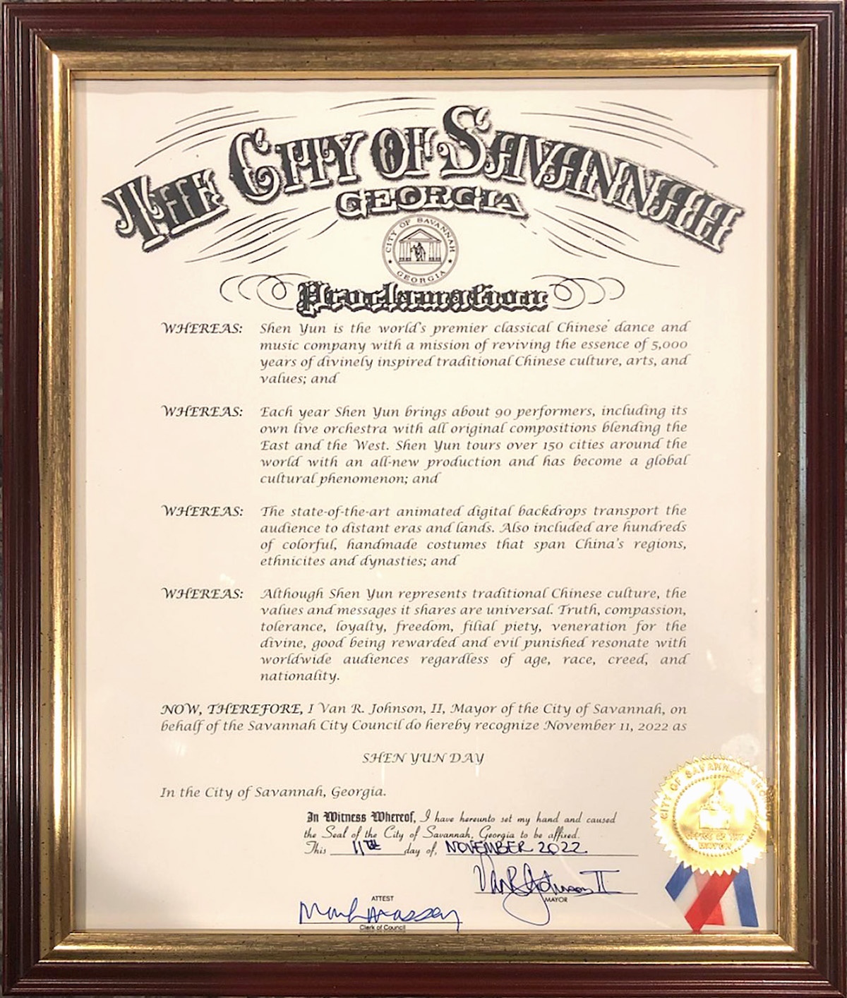 此次,神韻藝術團蒞臨喬治亞州演出,包括奧古斯塔(Augusta)市長哈迪﹒戴維斯(Hardie Davis Jr.)、薩凡納(Savannah)市長范﹒約翰遜(Van R. Johnson)和哥倫布(Columbus)市長B.H.亨德森(B.H. Henderson)也為神韻晚會頒發了褒獎。