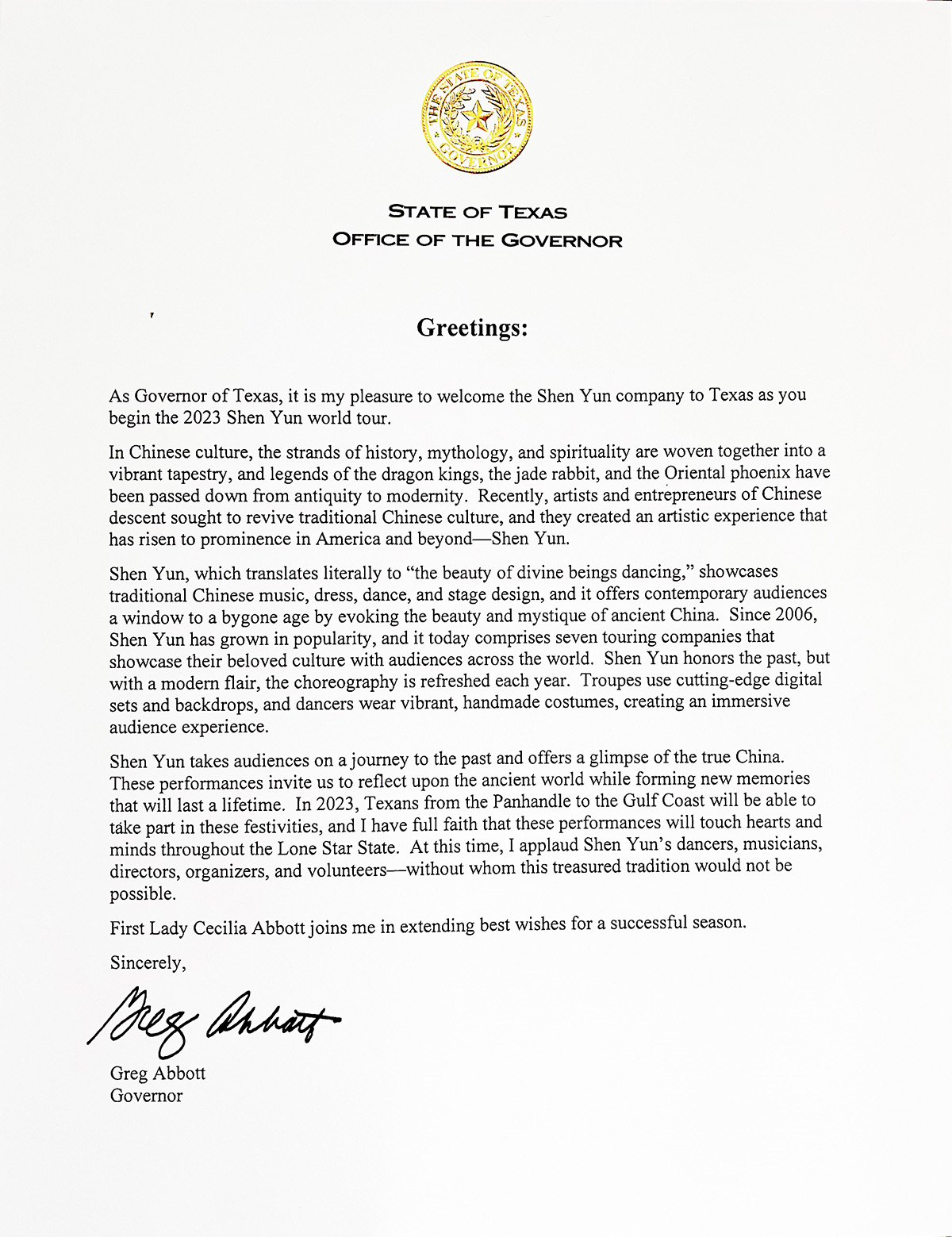 州長阿博特並在賀信中說:「神韻引領觀眾回到古代,讓觀眾一窺真實的中國。這些節目讓我們反思古代的世界,同時永遠銘記在心。」