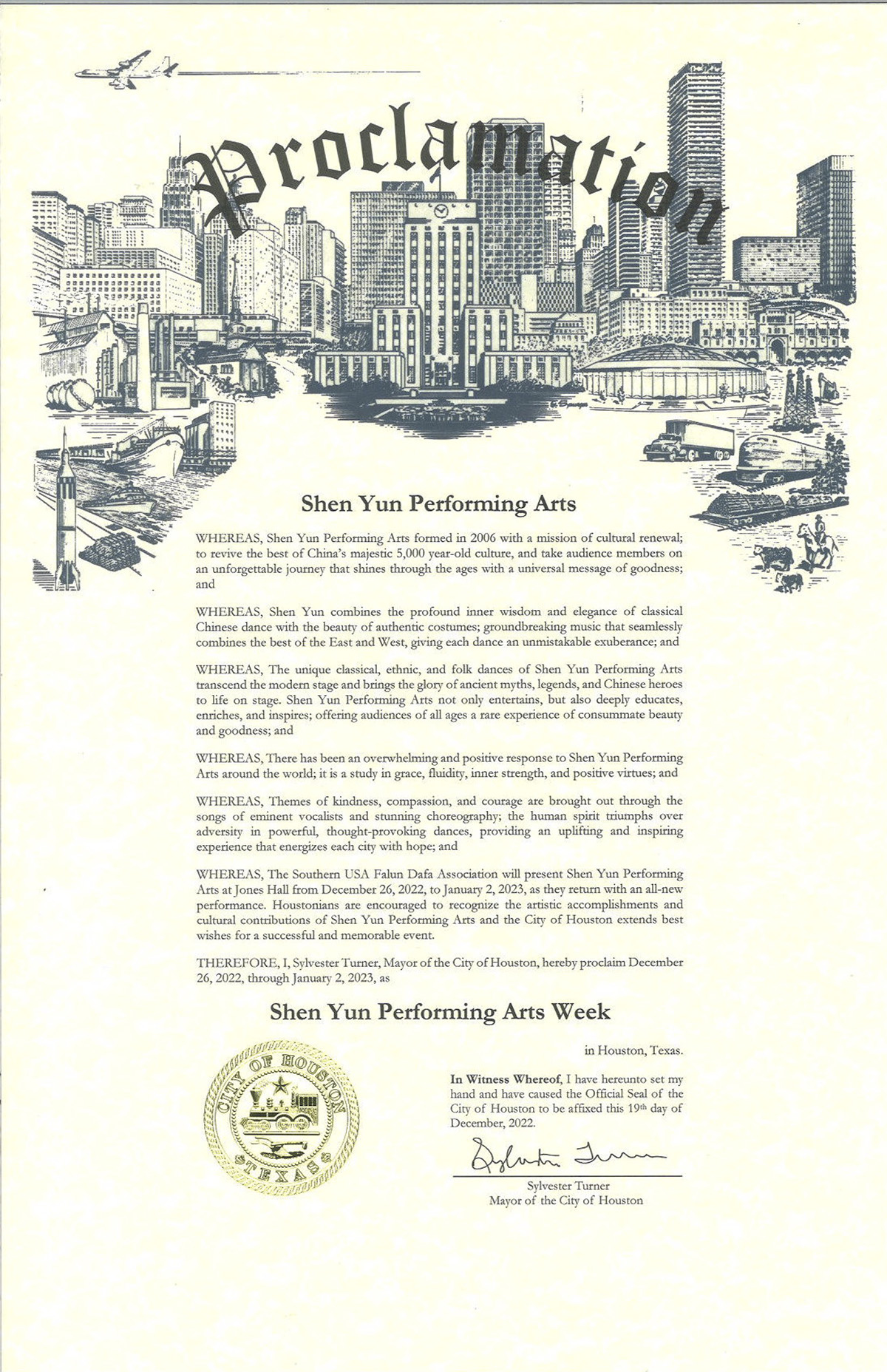 休斯頓市長西爾維斯特﹒特納(Sylvester Turner)特頒發褒獎令,宣布,二零二二年十二月二十六日至二零二三年一月二日,為休斯頓市的「神韻演出週」。