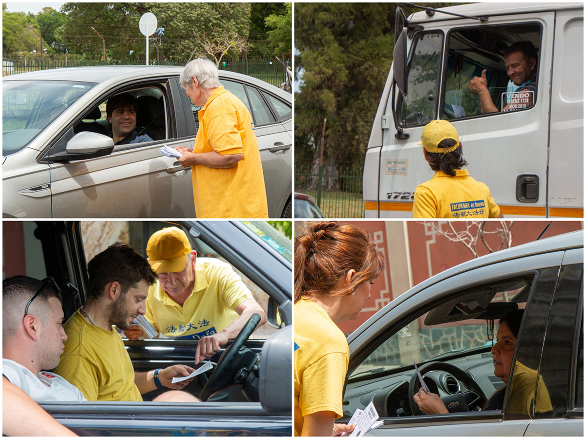 ![]() 圖6~7:在二零二二年阿根廷法會期間,學員來到阿根廷中共使館前和平抗議,向過往路人和車輛司機介紹法輪功,及揭露中共的迫害。 |