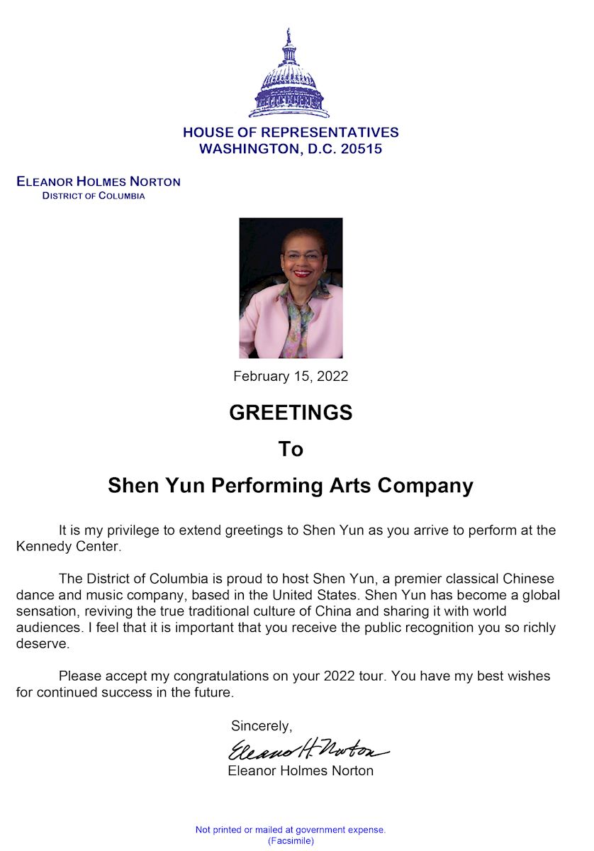 ![]() 圖13:華府國會眾議員諾頓(Eleanor Holmes Norton)在賀信中說:神韻復興真正的中國傳統文化,首屈一指。 |
