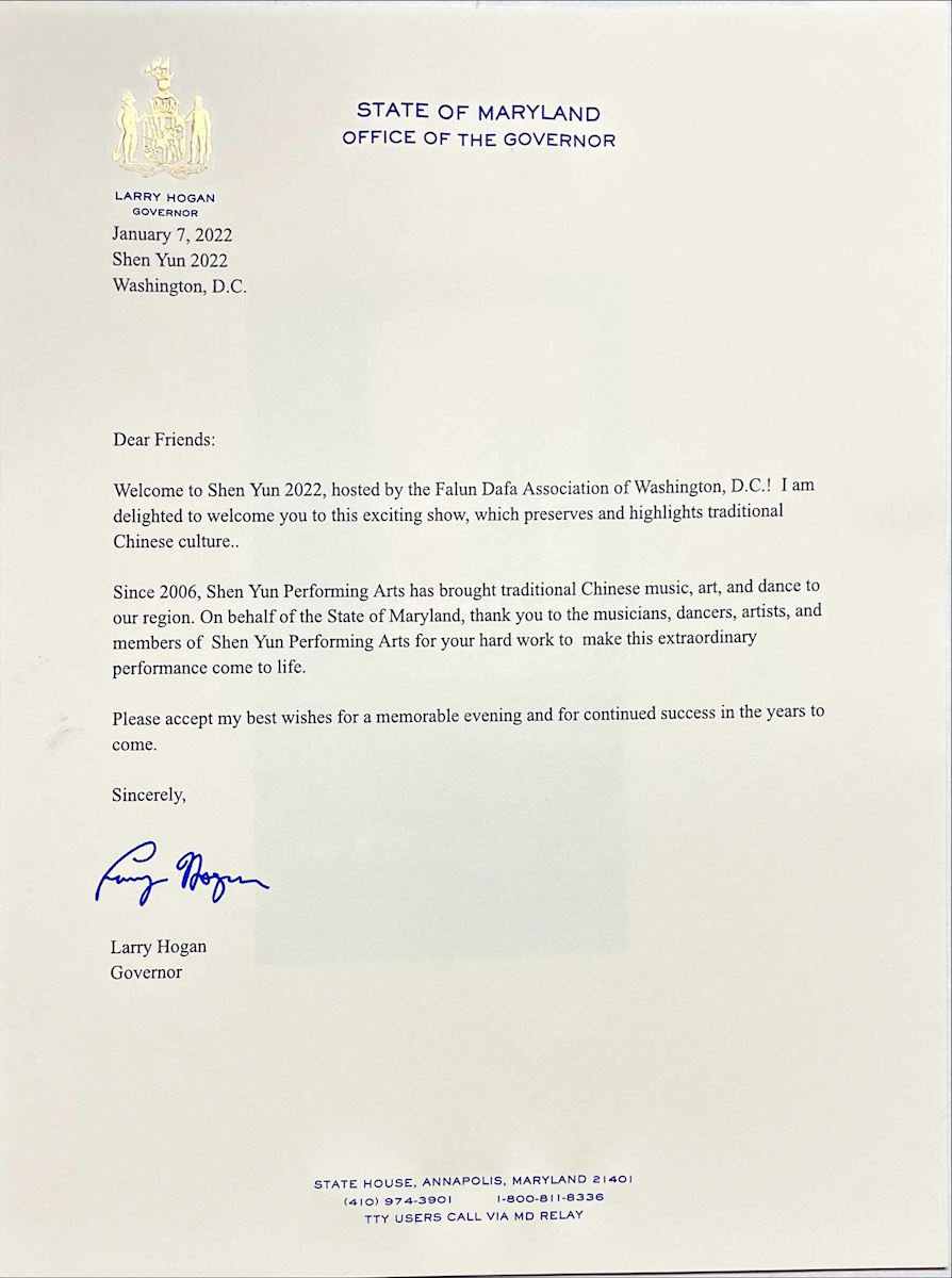 馬裏蘭州州長拉裏﹒霍根(Larry Hogan)歡迎神韻二零二二年度巡迴演出。霍根州長說: