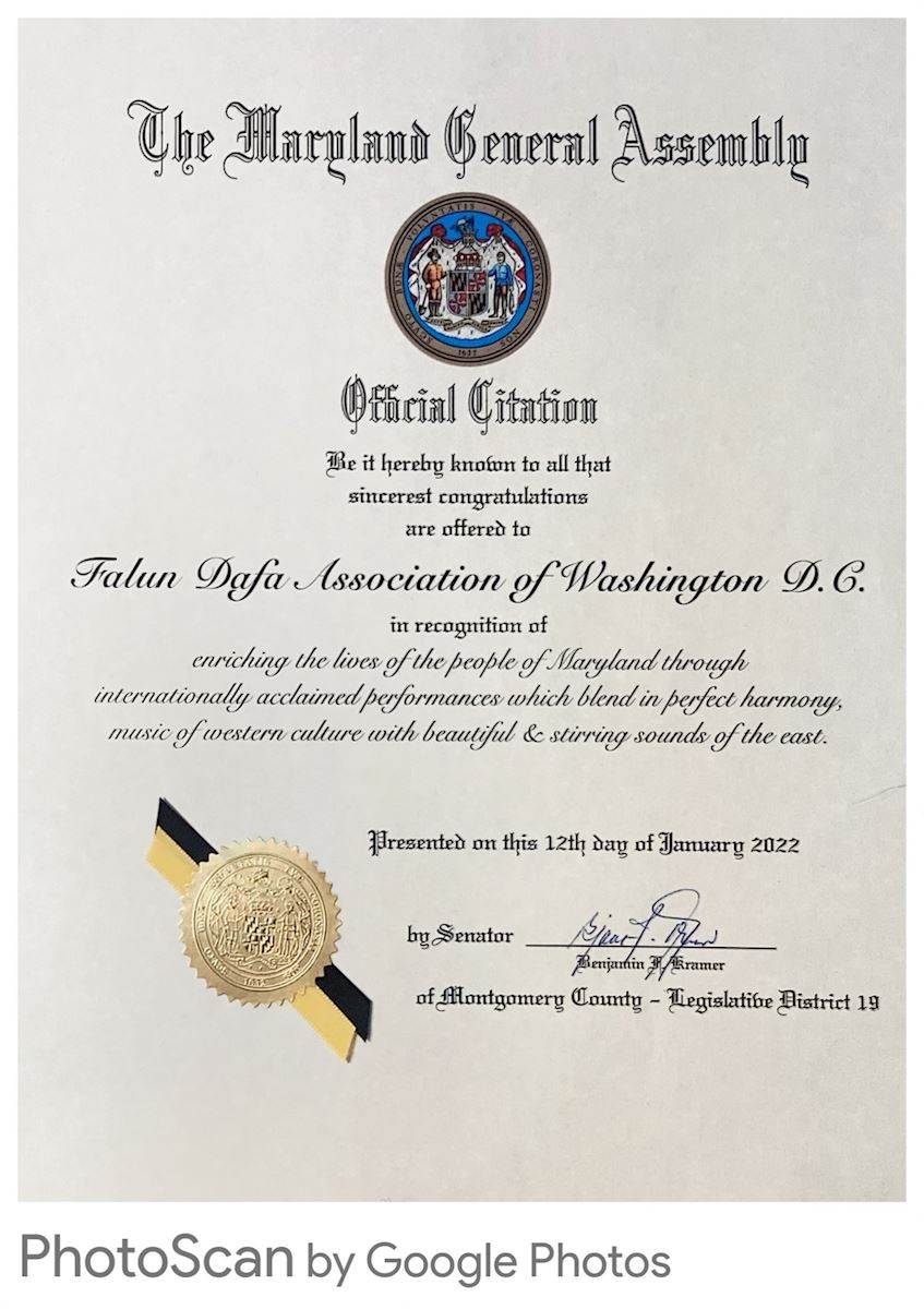 馬裏蘭州參議員本傑明﹒克拉莫(Benjamin F. Kramer)為華府神韻演出主辦方頒發褒獎。克拉莫議員在褒獎令中說:「享譽國際的(神韻)演出,將西方音樂與優美動人的東方樂音完美融合,豐富了馬裏蘭州民眾的生活。」