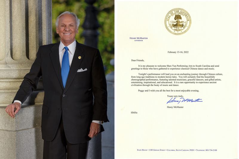 二零二二年二月十五日和十六日,神韻藝術團蒞臨美國南卡羅來納州的州府和最大城市──哥倫比亞的寇格藝術中心(Columbia Koger Center for the Arts)巡迴演出。南卡州州長亨利﹒麥克馬斯特(Henry McMaster)日前發來賀信,祝賀神韻演出成功,並讚揚神韻藝術家給南卡人民帶來中華傳統文化盛宴。