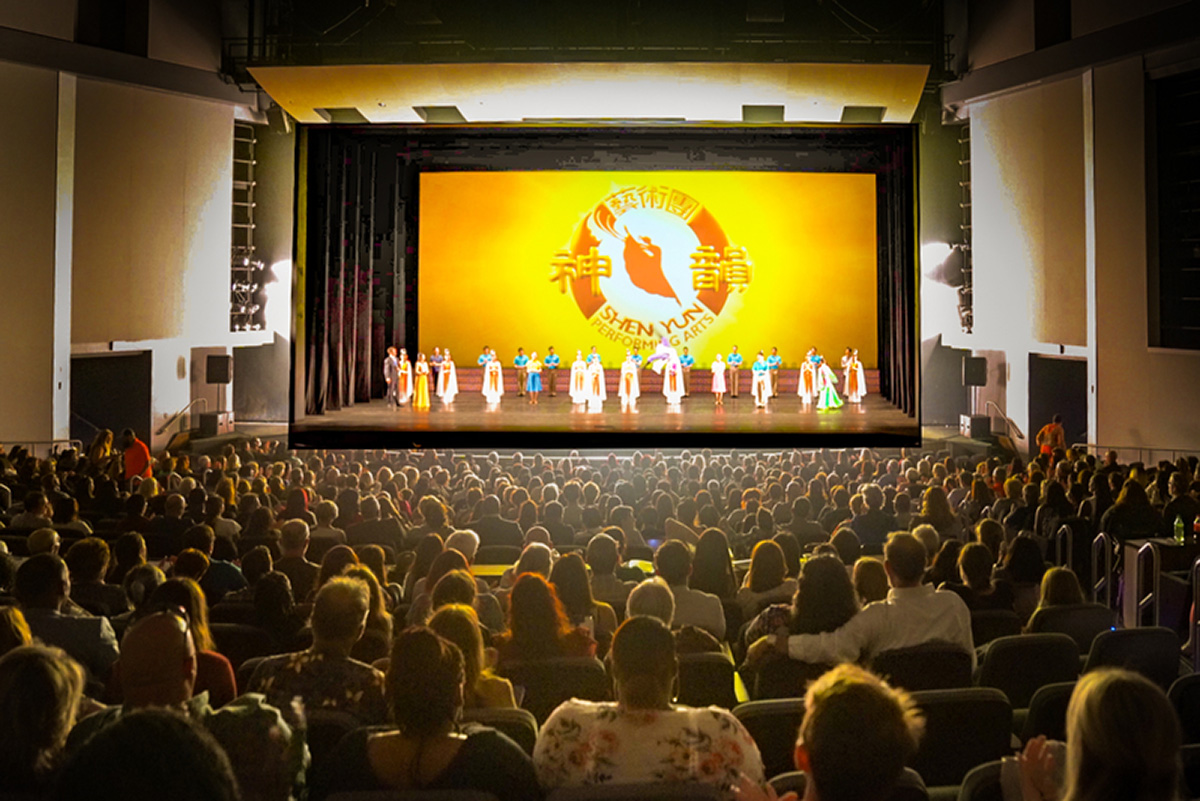 ![]() 圖4:二零二二年四月九日和十日,在路易斯安那州首府巴圖魯日(Baton Rouge)水上中心表演藝術劇院(River Center Theater for Performing Arts)的三場演出全爆滿。圖為4月9日晚演出謝幕照。(新唐人電視台) |