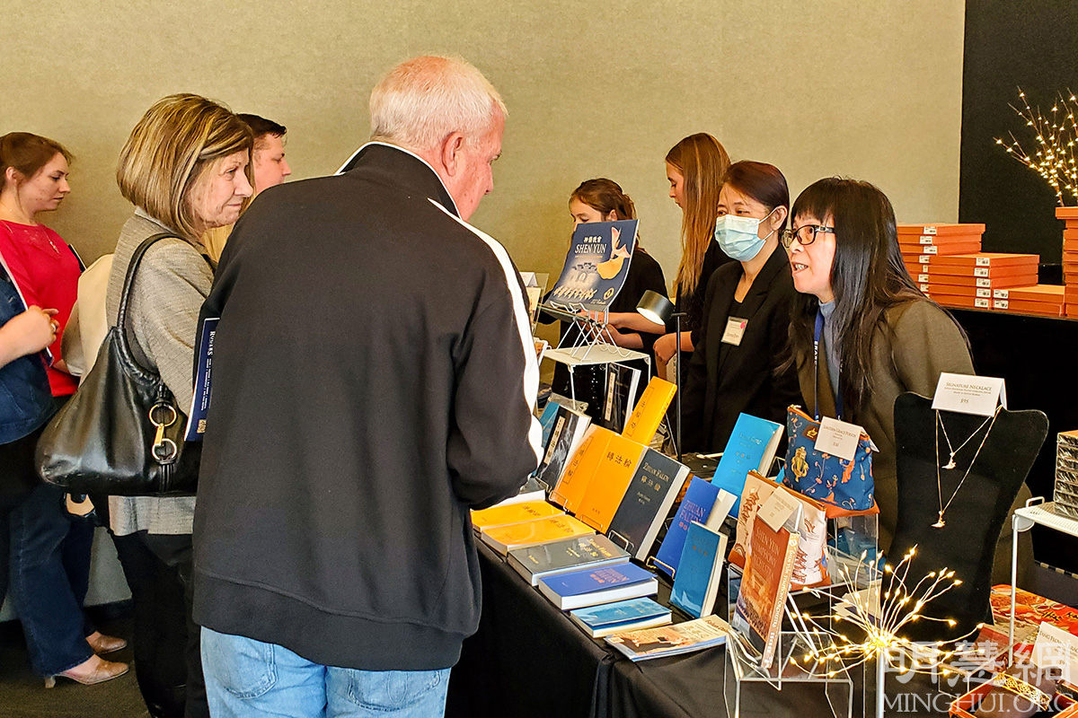 據在禮品櫃台工作的羅女士介紹,有很多觀眾來詢問這是甚麼書?羅女士告訴他們:「這是本修煉的書,法輪功的原則是真、善、忍。修煉法輪功可以讓身心受益,尤其是現在中共病毒(武漢肺炎)大流行期間,可以幫助人們增強免疫力,抵禦病毒的侵蝕。他們聽了很高興、很認同,並購買了《轉法輪》。」