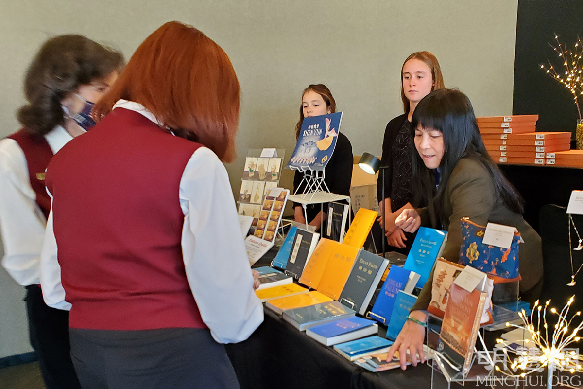 在禮品櫃台工作的陳女士說,當她知道要在神韻演出的劇院出售法輪大法書籍後,她的腦中就閃出一個意念:買書的人要來了。有緣的人要來找大法了。她表示,演出開始前,就已經有四、五個觀眾購買了《轉法輪》。