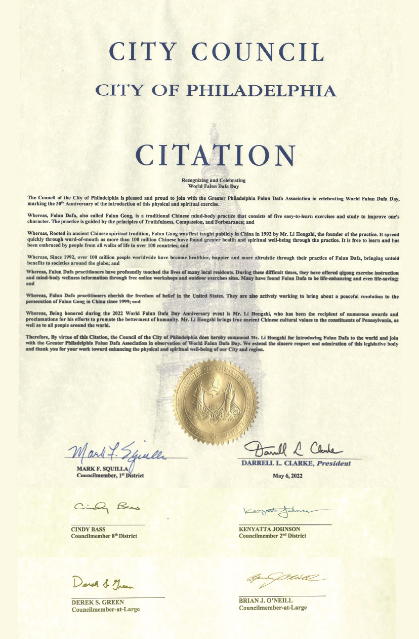 在二零二二年五月十三日世界法輪大法日到來之際,費城市議會主席達瑞爾﹒克拉克(Darrell Clarke)和五位市議員馬克﹒斯奎拉(Mark Squilla)、德裏克﹒格林(Derek Green)、辛迪﹒貝斯(Cindy Bass)、肯雅塔﹒約翰遜(Kenyatta Johnson)、布朗﹒偶奈爾(Brian O』neill)聯名發出褒獎狀,慶祝世界法輪大法日,表彰李洪志先生向世界洪傳法輪大法,感謝法輪功學員為提高社區民眾身心健康所做的一切。