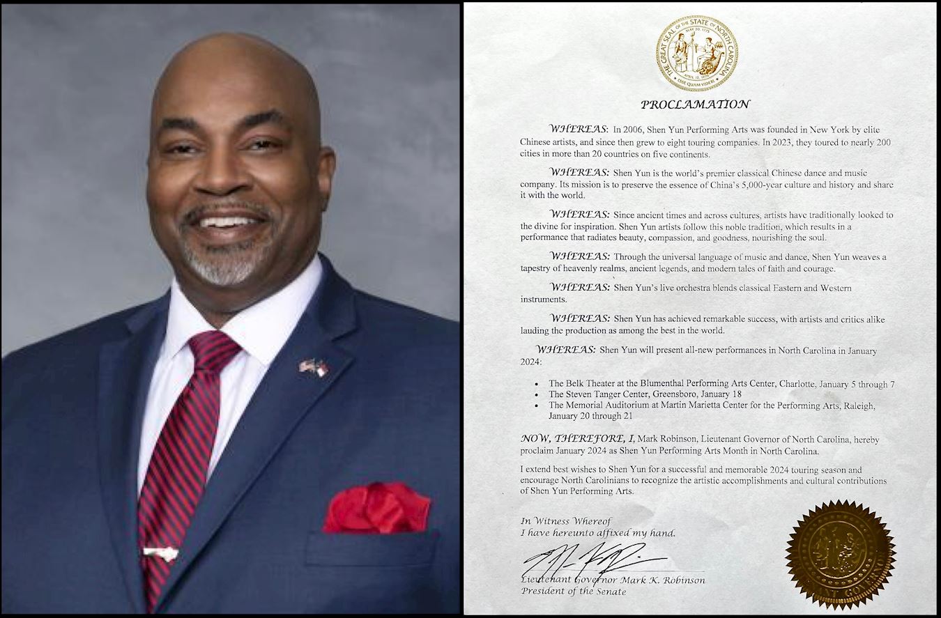 神韻演出在美國北卡州開始前二個月,北卡州副州長、參議院主席馬克﹒羅賓遜(Mark Robinson)特意頒發褒獎,宣布二零二四年一月為「北卡州神韻藝術月」。