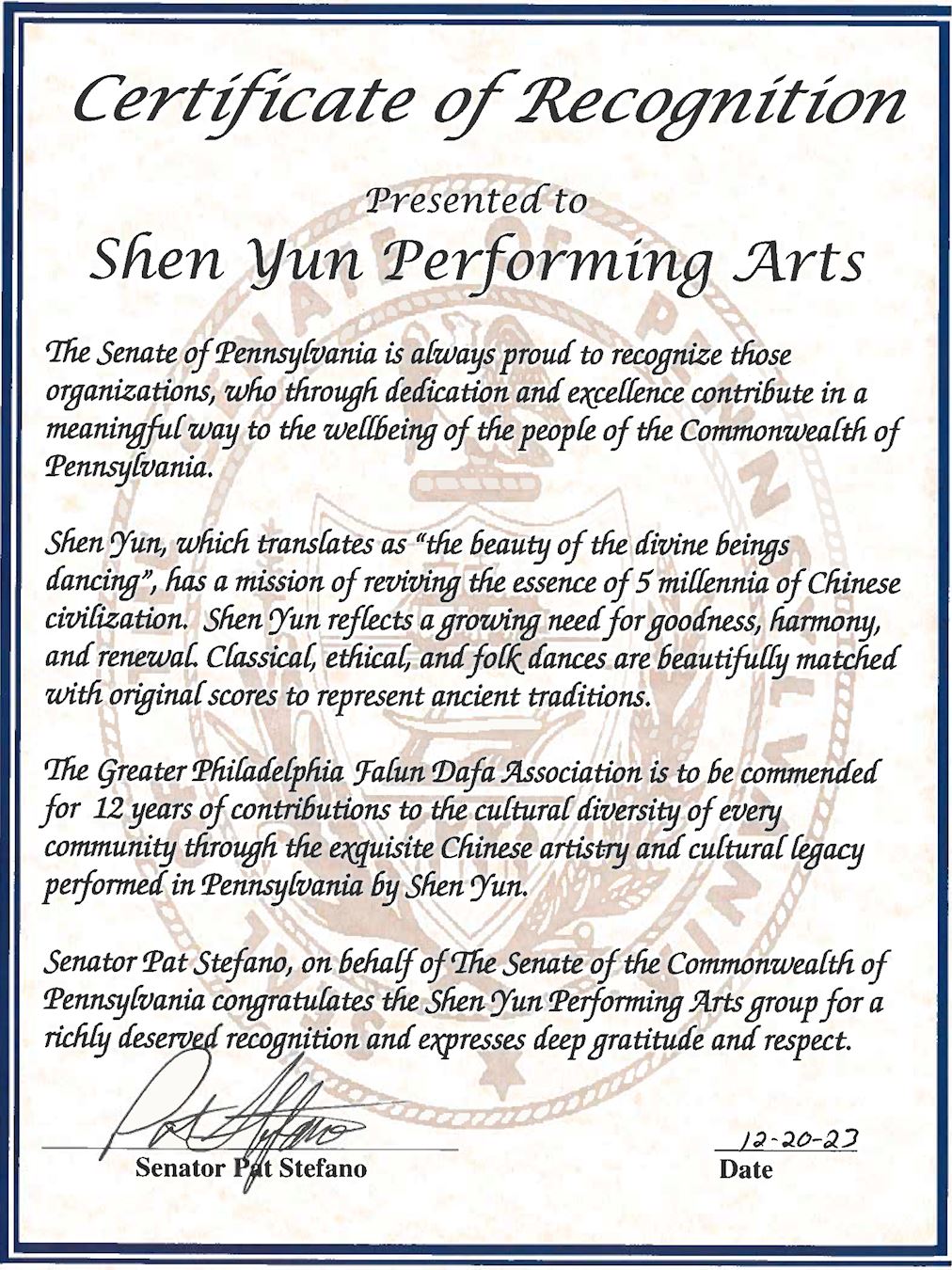 神韻將於二零二四年一月底及三月上旬在賓州演出,近期賓州第三十二區州參議員帕特﹒斯特法諾(Pat Stefano)代表賓州參議院發來褒獎狀。祝賀神韻藝術團獲得當之無愧的表彰,並表示深深的感謝和敬意。