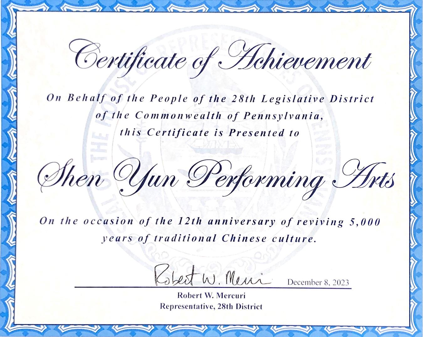 眾議員羅伯特﹒墨丘利(Robert W. Mercuri)在褒獎狀上寫道:「代表賓州二十八選區民眾褒獎神韻藝術團致力於恢復中華五千年傳統文化。」