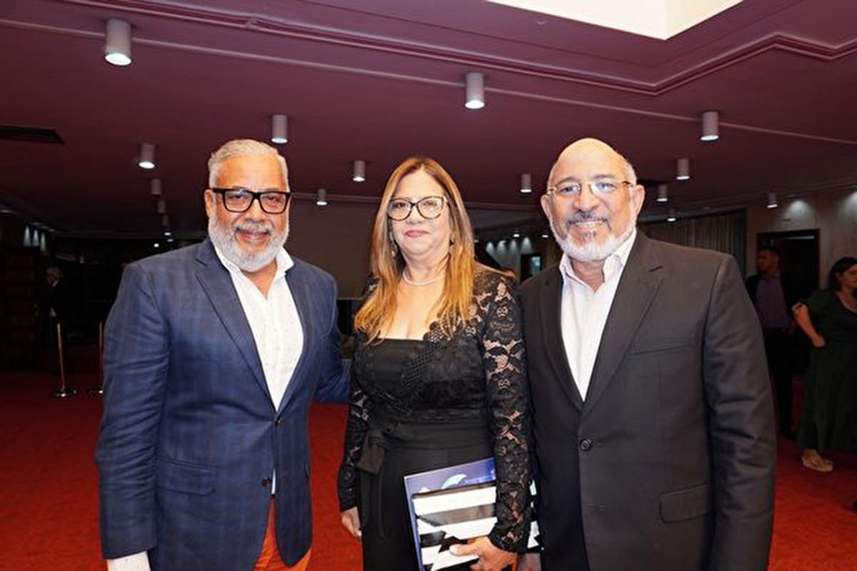 ![]() 圖9:多米尼加總統府信息和新聞部副主任盧西多﹒戈麥斯(Lucildo Gómez,右)和他的太太,及傳媒集團總裁安東尼﹒馬提(Anthony Marte,左)觀賞了神韻巡迴藝術團在聖地亞哥CIBAO大劇院(Grand Theater OF CIBAO Restoration Hall)的首場演出。(大紀元) |