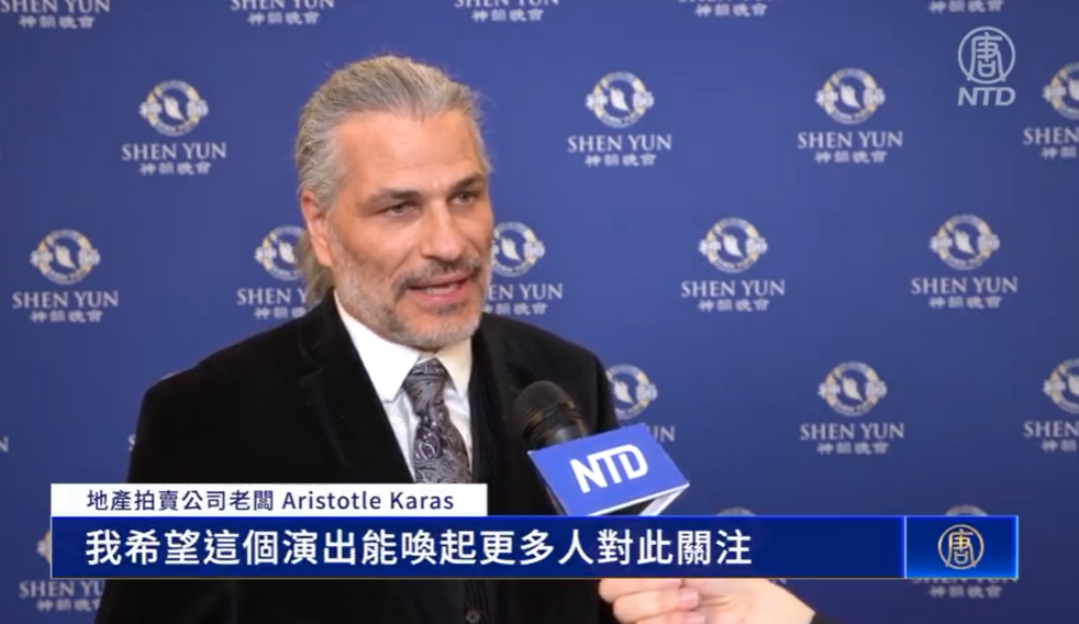 亞里士多德﹒卡拉斯(Aristotle Karas)是一家地產拍賣公司的老闆,其業務跨越美國十多個州。當日早晨他在油管上看到介紹神韻的視頻,就決定帶家人一起去欣賞當晚的演出。